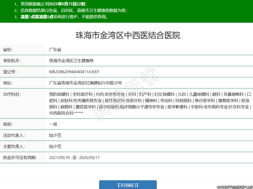 省份:廣東省審批機關:珠海市金灣區(qū)衛(wèi)生健康局登記號:MB2D8620944040411A3001地址:廣東省珠海市金灣區(qū)紅旗鎮(zhèn)和興中路30號診療科目:預防保健科 | 全科醫(yī)療科 | 內科;老年病專業(yè) | 外科 | 婦產科 | 婦女保健科 | 兒科 | 兒童保健科 | 眼科 | 耳鼻咽喉科 | 口腔科 | 皮膚科;性傳播疾病專業(yè) | 醫(yī)療美容科;美容外科 | 精神科 | 傳染科 | 結核病科 | 急診醫(yī)學科 | 康復醫(yī)學科 | 職業(yè)病科 | 麻醉科 | 重癥醫(yī)學科 | 醫(yī)學檢驗科;臨床細胞分子遺傳學專業(yè) | 醫(yī)學影像科 | 中醫(yī)科;老年病科專業(yè);針灸科專業(yè) | 中西醫(yī)結合科******級別:一級法定代表人:陸少范主要負責人:陸少范執(zhí)業(yè)許可證有效期:2021/09/18 -至- 2026/09/17 -