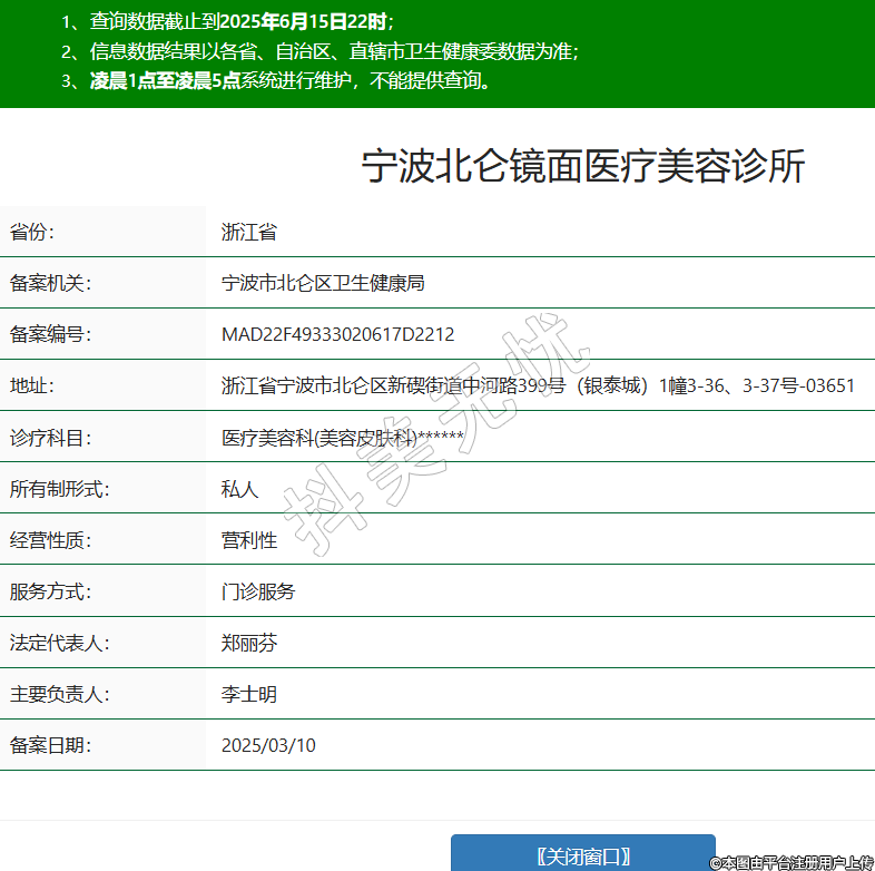 省份:浙江省備案機(jī)關(guān):寧波市北侖區(qū)衛(wèi)生健康局備案編號:MAD22F49333020617D2212地址:浙江省寧波市北侖區(qū)新碶街道中河路399號(銀泰城)1幢3-36、3-37號-03651診療科目:醫(yī)療美容科(美容皮膚科)******所有制形式:私人經(jīng)營性質(zhì):營利性服務(wù)方式:門診服務(wù)法定代表人:鄭麗芬主要負(fù)責(zé)人:李士明備案日期:2025/03/10 -