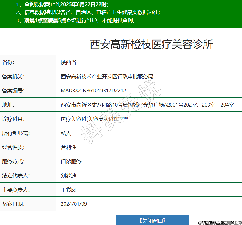 省份:陜西省備案機關:西安高新技術產業(yè)開發(fā)區(qū)行政審批服務局備案編號:MAD3X2JN861019317D2212地址:西安市高新區(qū)丈八四路10號景福城星光耀廣場A2001號202室、203室、204室診療科目:醫(yī)療美容科(美容皮膚科)******所有制形式:私人經營性質:營利性服務方式:門診服務法定代表人:劉夢迪主要負責人:王彩鳳備案日期:2024/01/09 -