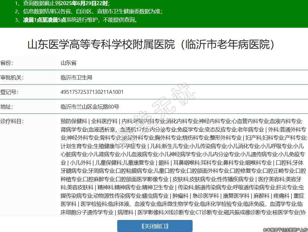 省份:山東省審批機(jī)關(guān):臨沂市衛(wèi)生局登記號(hào):49517572537130211A1001地址:臨沂市蘭山區(qū)金壇路80號(hào)診療科目:預(yù)防保健科 | 全科醫(yī)療科 | 內(nèi)科;呼吸內(nèi)科專業(yè);消化內(nèi)科專業(yè);神經(jīng)內(nèi)科專業(yè);心血管內(nèi)科專業(yè);血液內(nèi)科專業(yè);腎病學(xué)專業(yè)(血液透析室,血透機(jī)17臺(tái));內(nèi)分泌專業(yè);免疫學(xué)專業(yè);變態(tài)反應(yīng)專業(yè);老年病專業(yè) | 外科;普通外科專業(yè);神經(jīng)外科專業(yè);骨科專業(yè);泌尿外科專業(yè);胸外科專業(yè);燒傷科專業(yè);整形外科專業(yè) | 婦產(chǎn)科;婦科專業(yè);產(chǎn)科專業(yè);計(jì)劃生育專業(yè);生殖健康與不孕癥專業(yè) | 兒科;新生兒專業(yè);小兒傳染病專業(yè);小兒消化專業(yè);小兒呼吸專業(yè);小兒心臟病專業(yè);小兒腎病專業(yè);小兒血液病專業(yè);小兒神經(jīng)病學(xué)專業(yè);小兒內(nèi)分泌專業(yè);小兒遺傳病專業(yè);小兒免疫專業(yè) | 小兒外科 | 兒童保健科;兒童康復(fù)專業(yè) | 眼科 | 耳鼻咽喉科;耳科專業(yè);鼻科專業(yè);咽喉科專業(yè) | 口腔科;牙體牙髓病專業(yè);牙周病專業(yè);口腔粘膜病專業(yè);兒童口腔專業(yè);口腔頜面外科專業(yè);口腔修復(fù)專業(yè);口腔正畸專業(yè);口腔種植專業(yè);口腔麻醉專業(yè);口腔頜面醫(yī)學(xué)影像專業(yè) | 皮膚科;皮膚病專業(yè);性傳播疾病專業(yè) | 醫(yī)療美容科;美容牙科;美容皮膚科 | 精神科;精神病專業(yè);精神衛(wèi)生專業(yè) | 傳染科;腸道傳染病專業(yè);呼吸道傳染病專業(yè);肝炎專業(yè);蟲媒傳染病專業(yè);動(dòng)物源性傳染病專業(yè);蠕蟲病專業(yè) | 腫瘤科 | 急診醫(yī)學(xué)科 | 康復(fù)醫(yī)學(xué)科 | 麻醉科 | 疼痛科 | 重癥醫(yī)學(xué)科 | 醫(yī)學(xué)檢驗(yàn)科;臨床體液、血液專業(yè);臨床微生物學(xué)專業(yè);臨床化學(xué)檢驗(yàn)專業(yè);臨床免疫、血清學(xué)專業(yè);臨床細(xì)胞分子遺傳學(xué)專業(yè) | 病理科 | 醫(yī)學(xué)影像科;X線診斷專業(yè);CT診斷專業(yè);磁共振成像診斷專業(yè);核醫(yī)學(xué)專業(yè)(協(xié)議);超聲診斷專業(yè);心電診斷專業(yè);腦電及腦血流圖診斷專業(yè);神經(jīng)肌肉電圖專業(yè);介入放射學(xué)專業(yè) | 中醫(yī)科******級(jí)別:二級(jí)法定代表人:鄭佩芹主要負(fù)責(zé)人:鄭佩芹執(zhí)業(yè)許可證有效期:2025/06/17 -至- 2036/05/10 -
