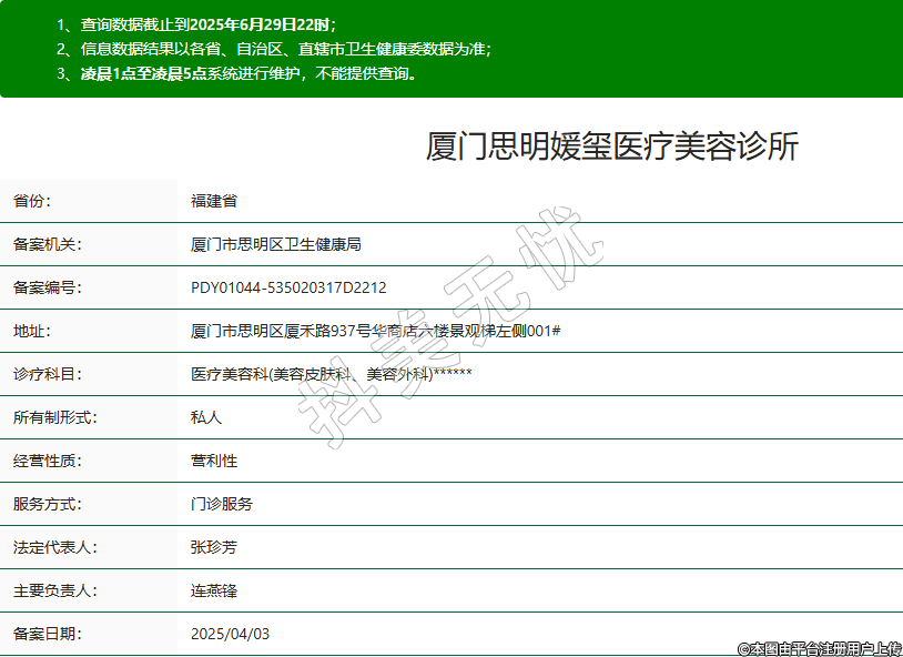 省份:福建省備案機(jī)關(guān):廈門市思明區(qū)衛(wèi)生健康局備案編號:PDY01044-535020317D2212地址:廈門市思明區(qū)廈禾路937號華商店六樓景觀梯左側(cè)001#診療科目:醫(yī)療美容科(美容皮膚科、美容外科)******所有制形式:私人經(jīng)營性質(zhì):營利性服務(wù)方式:門診服務(wù)法定代表人:張珍芳主要負(fù)責(zé)人:連燕鋒備案日期:2025/04/03 -