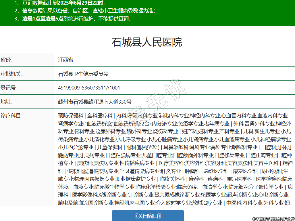 省份:江西省審批機關:石城縣衛(wèi)生健康委員會登記號:49199009-536073511A1001地址:贛州市石城縣贛江源南大道330號診療科目:預防保健科 | 全科醫(yī)療科 | 內(nèi)科;呼吸內(nèi)科專業(yè);消化內(nèi)科專業(yè);神經(jīng)內(nèi)科專業(yè);心血管內(nèi)科專業(yè);血液內(nèi)科專業(yè);腎病學專業(yè)(“血液透析室”血液透析機52臺);內(nèi)分泌專業(yè);免疫學專業(yè);老年病專業(yè) | 外科;普通外科專業(yè);神經(jīng)外科專業(yè);骨科專業(yè);泌尿外科專業(yè);胸外科專業(yè);燒傷科專業(yè) | 婦產(chǎn)科;婦科專業(yè);產(chǎn)科專業(yè) | 兒科;新生兒專業(yè);小兒傳染病專業(yè);小兒消化專業(yè);小兒呼吸專業(yè);小兒心臟病專業(yè);小兒腎病專業(yè);小兒血液病專業(yè);小兒神經(jīng)病學專業(yè);小兒內(nèi)分泌專業(yè) | 兒童保健科 | 眼科(眼視光科) | 耳鼻咽喉科;耳科專業(yè);鼻科專業(yè);咽喉科專業(yè) | 口腔科;牙體牙髓病專業(yè);牙周病專業(yè);口腔粘膜病專業(yè);兒童口腔專業(yè);口腔頜面外科專業(yè);口腔修復專業(yè);口腔正畸專業(yè);口腔種植專業(yè) | 皮膚科;皮膚病專業(yè);性傳播疾病專業(yè) | 醫(yī)療美容科;美容外科;美容牙科;美容皮膚科;美容中醫(yī)科 | 精神科 | 傳染科;腸道傳染病專業(yè);呼吸道傳染病專業(yè);肝炎專業(yè) | 腫瘤科 | 急診醫(yī)學科 | 康復醫(yī)學科 | 職業(yè)病科;塵肺專業(yè);物理因素損傷專業(yè);職業(yè)健康監(jiān)護專業(yè) | 臨終關懷科 | 麻醉科 | 疼痛科 | 重癥醫(yī)學科 | 醫(yī)學檢驗科;臨床體液、血液專業(yè);臨床微生物學專業(yè);臨床化學檢驗專業(yè);臨床免疫、血清學專業(yè);臨床細胞分子遺傳學專業(yè) | 病理科 | 醫(yī)學影像科;X線診斷專業(yè);CT診斷專業(yè);磁共振成像診斷專業(yè);核醫(yī)學專業(yè);超聲診斷專業(yè);心電診斷專業(yè);腦電及腦血流圖診斷專業(yè);神經(jīng)肌肉電圖專業(yè);介入放射學專業(yè);放射治療專業(yè) | 中醫(yī)科;內(nèi)科專業(yè);外科專業(yè);婦產(chǎn)科專業(yè);兒科專業(yè);皮膚科專業(yè);腫瘤科專業(yè);骨傷科專業(yè);肛腸科專業(yè);老年病科專業(yè);針灸科專業(yè);推拿科專業(yè);康復醫(yī)學專業(yè);急診科專業(yè);預防保健科專業(yè) | 中西醫(yī)結合科******級別:三級法定代表人:吳優(yōu)明主要負責人:吳優(yōu)明執(zhí)業(yè)許可證有效期:2024/07/01 -至- 2029/06/30 -