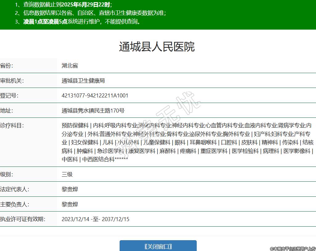 省份:湖北省審批機(jī)關(guān):通城縣衛(wèi)生健康局登記號:42131077-942122211A1001地址:通城縣雋水鎮(zhèn)民主路170號診療科目:預(yù)防保健科 | 內(nèi)科;呼吸內(nèi)科專業(yè);消化內(nèi)科專業(yè);神經(jīng)內(nèi)科專業(yè);心血管內(nèi)科專業(yè);血液內(nèi)科專業(yè);腎病學(xué)專業(yè);內(nèi)分泌專業(yè) | 外科;普通外科專業(yè);神經(jīng)外科專業(yè);骨科專業(yè);泌尿外科專業(yè);胸外科專業(yè) | 婦產(chǎn)科;婦科專業(yè);產(chǎn)科專業(yè) | 婦女保健科 | 兒科 | 小兒外科 | 兒童保健科 | 眼科 | 耳鼻咽喉科 | 口腔科 | 皮膚科 | 精神科 | 傳染科 | 結(jié)核病科 | 腫瘤科 | 急診醫(yī)學(xué)科 | 康復(fù)醫(yī)學(xué)科 | 麻醉科 | 疼痛科 | 重癥醫(yī)學(xué)科 | 醫(yī)學(xué)檢驗科 | 病理科 | 醫(yī)學(xué)影像科 | 中醫(yī)科 | 中西醫(yī)結(jié)合科******級別:三級法定代表人:黎貴焊主要負(fù)責(zé)人:黎貴焊執(zhí)業(yè)許可證有效期:2023/12/14 -至- 2037/12/15 -