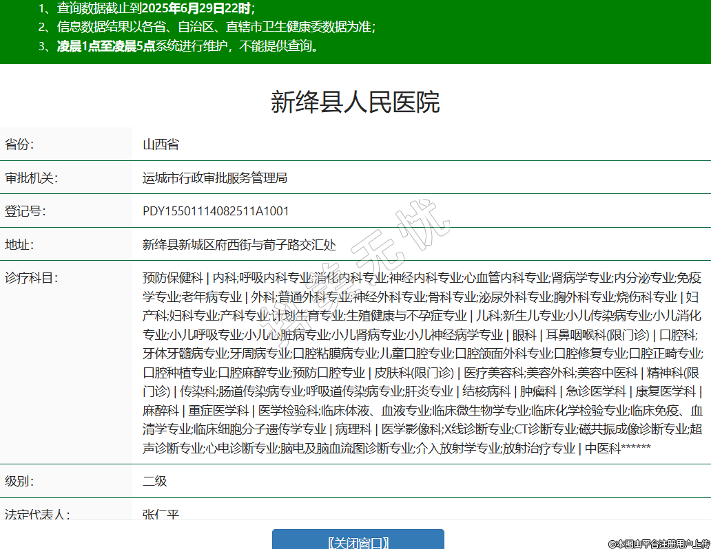 省份:山西省審批機(jī)關(guān):運(yùn)城市行政審批服務(wù)管理局登記號(hào):PDY15501114082511A1001地址:新絳縣新城區(qū)府西街與荀子路交匯處診療科目:預(yù)防保健科 | 內(nèi)科;呼吸內(nèi)科專業(yè);消化內(nèi)科專業(yè);神經(jīng)內(nèi)科專業(yè);心血管內(nèi)科專業(yè);腎病學(xué)專業(yè);內(nèi)分泌專業(yè);免疫學(xué)專業(yè);老年病專業(yè) | 外科;普通外科專業(yè);神經(jīng)外科專業(yè);骨科專業(yè);泌尿外科專業(yè);胸外科專業(yè);燒傷科專業(yè) | 婦產(chǎn)科;婦科專業(yè);產(chǎn)科專業(yè);計(jì)劃生育專業(yè);生殖健康與不孕癥專業(yè) | 兒科;新生兒專業(yè);小兒傳染病專業(yè);小兒消化專業(yè);小兒呼吸專業(yè);小兒心臟病專業(yè);小兒腎病專業(yè);小兒神經(jīng)病學(xué)專業(yè) | 眼科 | 耳鼻咽喉科(限門診) | 口腔科;牙體牙髓病專業(yè);牙周病專業(yè);口腔粘膜病專業(yè);兒童口腔專業(yè);口腔頜面外科專業(yè);口腔修復(fù)專業(yè);口腔正畸專業(yè);口腔種植專業(yè);口腔麻醉專業(yè);預(yù)防口腔專業(yè) | 皮膚科(限門診) | 醫(yī)療美容科;美容外科;美容中醫(yī)科 | 精神科(限門診) | 傳染科;腸道傳染病專業(yè);呼吸道傳染病專業(yè);肝炎專業(yè) | 結(jié)核病科 | 腫瘤科 | 急診醫(yī)學(xué)科 | 康復(fù)醫(yī)學(xué)科 | 麻醉科 | 重癥醫(yī)學(xué)科 | 醫(yī)學(xué)檢驗(yàn)科;臨床體液、血液專業(yè);臨床微生物學(xué)專業(yè);臨床化學(xué)檢驗(yàn)專業(yè);臨床免疫、血清學(xué)專業(yè);臨床細(xì)胞分子遺傳學(xué)專業(yè) | 病理科 | 醫(yī)學(xué)影像科;X線診斷專業(yè);CT診斷專業(yè);磁共振成像診斷專業(yè);超聲診斷專業(yè);心電診斷專業(yè);腦電及腦血流圖診斷專業(yè);介入放射學(xué)專業(yè);放射治療專業(yè) | 中醫(yī)科******級(jí)別:二級(jí)法定代表人:張仁平主要負(fù)責(zé)人:張仁平執(zhí)業(yè)許可證有效期:2025/06/03 -至- 2036/08/31 -