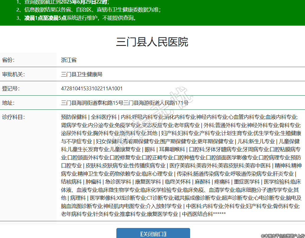 省份:浙江省審批機(jī)關(guān):三門縣衛(wèi)生健康局登記號:47281041533102211A1001地址:三門縣海潤街道泰和路15號三門縣海游街道人民路171號診療科目:預(yù)防保健科 | 全科醫(yī)療科 | 內(nèi)科;呼吸內(nèi)科專業(yè);消化內(nèi)科專業(yè);神經(jīng)內(nèi)科專業(yè);心血管內(nèi)科專業(yè);血液內(nèi)科專業(yè);腎病學(xué)專業(yè);內(nèi)分泌專業(yè);免疫學(xué)專業(yè);變態(tài)反應(yīng)專業(yè);老年病專業(yè) | 外科;普通外科專業(yè);神經(jīng)外科專業(yè);骨科專業(yè);泌尿外科專業(yè);胸外科專業(yè);燒傷科專業(yè);其他 | 婦產(chǎn)科;婦科專業(yè);產(chǎn)科專業(yè);計劃生育專業(yè);優(yōu)生學(xué)專業(yè);生殖健康與不孕癥專業(yè) | 婦女保健科;青春期保健專業(yè);圍產(chǎn)期保健專業(yè);更年期保健專業(yè) | 兒科;新生兒專業(yè) | 兒童保健科;兒童生長發(fā)育專業(yè);兒童康復(fù)專業(yè) | 眼科 | 耳鼻咽喉科 | 口腔科;牙體牙髓病專業(yè);牙周病專業(yè);口腔粘膜病專業(yè);口腔頜面外科專業(yè);口腔修復(fù)專業(yè);口腔正畸專業(yè);口腔種植專業(yè);口腔頜面醫(yī)學(xué)影像專業(yè);口腔病理專業(yè);預(yù)防口腔專業(yè) | 皮膚科;皮膚病專業(yè);性傳播疾病專業(yè) | 醫(yī)療美容科;美容外科;美容皮膚科;美容中醫(yī)科 | 精神科;精神病專業(yè);精神衛(wèi)生專業(yè);藥物依賴專業(yè);臨床心理專業(yè) | 傳染科;腸道傳染病專業(yè);呼吸道傳染病專業(yè);肝炎專業(yè) | 結(jié)核病科 | 腫瘤科 | 急診醫(yī)學(xué)科 | 康復(fù)醫(yī)學(xué)科 | 臨終關(guān)懷科 | 麻醉科 | 疼痛科 | 重癥醫(yī)學(xué)科 | 醫(yī)學(xué)檢驗科;臨床體液、血液專業(yè);臨床微生物學(xué)專業(yè);臨床化學(xué)檢驗專業(yè);臨床免疫、血清學(xué)專業(yè);臨床細(xì)胞分子遺傳學(xué)專業(yè);其他 | 病理科 | 醫(yī)學(xué)影像科;X線診斷專業(yè);CT診斷專業(yè);磁共振成像診斷專業(yè);超聲診斷專業(yè);心電診斷專業(yè);腦電及腦血流圖診斷專業(yè);神經(jīng)肌肉電圖專業(yè);介入放射學(xué)專業(yè) | 中醫(yī)科;內(nèi)科專業(yè);外科專業(yè);婦產(chǎn)科專業(yè);骨傷科專業(yè);老年病科專業(yè);針灸科專業(yè);推拿科專業(yè);康復(fù)醫(yī)學(xué)專業(yè) | 中西醫(yī)結(jié)合科******級別:三級法定代表人:黎宏章主要負(fù)責(zé)人:黎宏章執(zhí)業(yè)許可證有效期:2015/11/10 -至- 2030/11/09 -