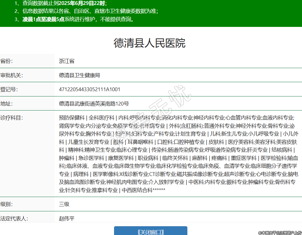 省份:浙江省審批機(jī)關(guān):德清縣衛(wèi)生健康局登記號(hào):47122054433052111A1001地址:德清縣武康街道英溪南路120號(hào)診療科目:預(yù)防保健科 | 全科醫(yī)療科 | 內(nèi)科;呼吸內(nèi)科專(zhuān)業(yè);消化內(nèi)科專(zhuān)業(yè);神經(jīng)內(nèi)科專(zhuān)業(yè);心血管內(nèi)科專(zhuān)業(yè);血液內(nèi)科專(zhuān)業(yè);腎病學(xué)專(zhuān)業(yè);內(nèi)分泌專(zhuān)業(yè);免疫學(xué)專(zhuān)業(yè);老年病專(zhuān)業(yè) | 外科(含肛腸科);普通外科專(zhuān)業(yè);神經(jīng)外科專(zhuān)業(yè);骨科專(zhuān)業(yè);泌尿外科專(zhuān)業(yè);胸外科專(zhuān)業(yè) | 婦產(chǎn)科;婦科專(zhuān)業(yè);產(chǎn)科專(zhuān)業(yè);計(jì)劃生育專(zhuān)業(yè) | 兒科;新生兒專(zhuān)業(yè);小兒呼吸專(zhuān)業(yè) | 小兒外科 | 兒童生長(zhǎng)發(fā)育專(zhuān)業(yè) | 眼科 | 耳鼻咽喉科 | 口腔科;口腔種植專(zhuān)業(yè) | 皮膚科 | 醫(yī)療美容科;美容牙科;美容皮膚科 | 精神科;精神衛(wèi)生專(zhuān)業(yè);臨床心理專(zhuān)業(yè) | 傳染科;腸道傳染病專(zhuān)業(yè);呼吸道傳染病專(zhuān)業(yè);肝炎專(zhuān)業(yè) | 結(jié)核病科 | 腫瘤科 | 急診醫(yī)學(xué)科 | 康復(fù)醫(yī)學(xué)科 | 職業(yè)病科 | 臨終關(guān)懷科 | 麻醉科 | 疼痛科 | 重癥醫(yī)學(xué)科 | 醫(yī)學(xué)檢驗(yàn)科(輸血科);臨床體液、血液專(zhuān)業(yè);臨床微生物學(xué)專(zhuān)業(yè);臨床化學(xué)檢驗(yàn)專(zhuān)業(yè);臨床免疫、血清學(xué)專(zhuān)業(yè);臨床細(xì)胞分子遺傳學(xué)專(zhuān)業(yè) | 病理科 | 醫(yī)學(xué)影像科;X線診斷專(zhuān)業(yè);CT診斷專(zhuān)業(yè);磁共振成像診斷專(zhuān)業(yè);超聲診斷專(zhuān)業(yè);心電診斷專(zhuān)業(yè);腦電及腦血流圖診斷專(zhuān)業(yè);神經(jīng)肌肉電圖專(zhuān)業(yè);介入放射學(xué)專(zhuān)業(yè) | 中醫(yī)科;內(nèi)科專(zhuān)業(yè);眼科專(zhuān)業(yè);腫瘤科專(zhuān)業(yè);骨傷科專(zhuān)業(yè);針灸科專(zhuān)業(yè);推拿科專(zhuān)業(yè) | 中西醫(yī)結(jié)合科******級(jí)別:三級(jí)法定代表人:趙偉平主要負(fù)責(zé)人:趙偉平執(zhí)業(yè)許可證有效期:2025/03/20 -至- 2039/06/05 -
