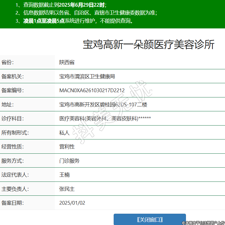 省份:陜西省備案機(jī)關(guān):寶雞市渭濱區(qū)衛(wèi)生健康局備案編號:MACN0XA6261030217D2212地址:寶雞市高新開發(fā)區(qū)碧桂園62DS-107二樓診療科目:醫(yī)療美容科(美容外科、美容皮膚科)******所有制形式:私人經(jīng)營性質(zhì):營利性服務(wù)方式:門診服務(wù)法定代表人:王楠主要負(fù)責(zé)人:張民主備案日期:2025/01/02 -