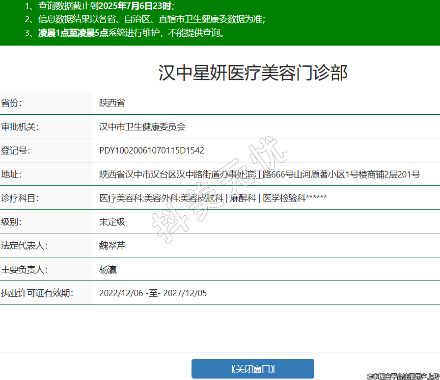 省份:陜西省審批機(jī)關(guān):漢中市衛(wèi)生健康委員會(huì)登記號(hào):PDY10020061070115D1542地址:陜西省漢中市漢臺(tái)區(qū)漢中路街道辦事處濱江路666號(hào)山河原著小區(qū)1號(hào)樓商鋪2層201號(hào)診療科目:醫(yī)療美容科;美容外科;美容皮膚科 | 麻醉科 | 醫(yī)學(xué)檢驗(yàn)科******級(jí)別:未定級(jí)法定代表人:魏翠芹主要負(fù)責(zé)人:楊瀛執(zhí)業(yè)許可證有效期:2022/12/06 -至- 2027/12/05 -