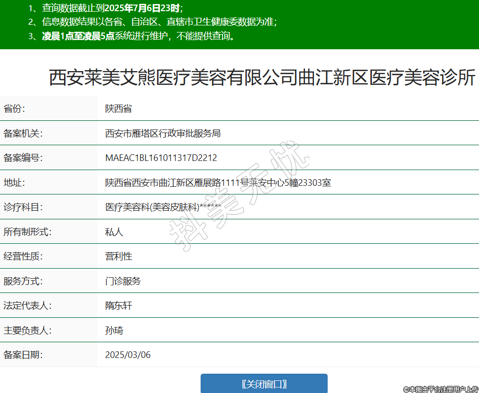 西安萊美艾熊醫(yī)療美容有限公司曲江新區(qū)醫(yī)療美容診所,診療科目:醫(yī)療美容科(美容皮膚科)******