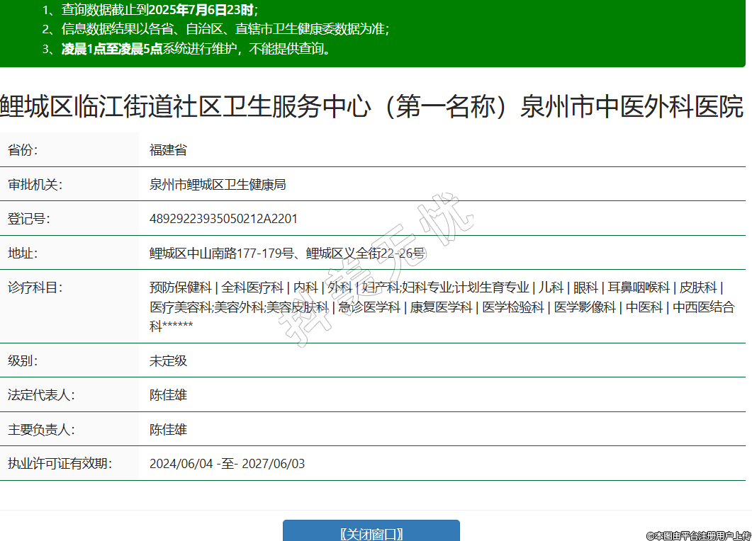 省份:福建省審批機關(guān):泉州市鯉城區(qū)衛(wèi)生健康局登記號:48929223935050212A2201地址:鯉城區(qū)中山南路177-179號、鯉城區(qū)義全街22-26號診療科目:預(yù)防保健科 | 全科醫(yī)療科 | 內(nèi)科 | 外科 | 婦產(chǎn)科;婦科專業(yè);計劃生育專業(yè) | 兒科 | 眼科 | 耳鼻咽喉科 | 皮膚科 | 醫(yī)療美容科;美容外科;美容皮膚科 | 急診醫(yī)學(xué)科 | 康復(fù)醫(yī)學(xué)科 | 醫(yī)學(xué)檢驗科 | 醫(yī)學(xué)影像科 | 中醫(yī)科 | 中西醫(yī)結(jié)合科******級別:未定級法定代表人:陳佳雄主要負責(zé)人:陳佳雄執(zhí)業(yè)許可證有效期:2024/06/04 -至- 2027/06/03 -