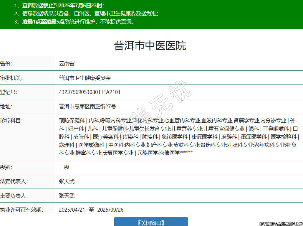 省份:云南省審批機關(guān):普洱市衛(wèi)生健康委員會登記號:43237569053080111A2101地址:普洱市思茅區(qū)南正街27號診療科目:預(yù)防保健科 | 內(nèi)科;呼吸內(nèi)科專業(yè);消化內(nèi)科專業(yè);心血管內(nèi)科專業(yè);血液內(nèi)科專業(yè);腎病學(xué)專業(yè);內(nèi)分泌專業(yè) | 外科 | 婦產(chǎn)科 | 兒科 | 兒童保健科;兒童生長發(fā)育專業(yè);兒童營養(yǎng)專業(yè);兒童五官保健專業(yè) | 眼科 | 耳鼻咽喉科 | 口腔科 | 皮膚科 | 醫(yī)療美容科 | 傳染科 | 腫瘤科 | 急診醫(yī)學(xué)科 | 康復(fù)醫(yī)學(xué)科 | 麻醉科 | 重癥醫(yī)學(xué)科 | 醫(yī)學(xué)檢驗科 | 病理科 | 醫(yī)學(xué)影像科 | 中醫(yī)科;內(nèi)科專業(yè);婦產(chǎn)科專業(yè);皮膚科專業(yè);骨傷科專業(yè);肛腸科專業(yè);老年病科專業(yè);針灸科專業(yè);推拿科專業(yè);康復(fù)醫(yī)學(xué)專業(yè) | 民族醫(yī)學(xué)科;傣醫(yī)學(xué)******級別:三級法定代表人:張?zhí)煳?/div>主要負責(zé)人:張?zhí)煳?/div>執(zhí)業(yè)許可證有效期:2025/04/21 -至- 2025/09/26