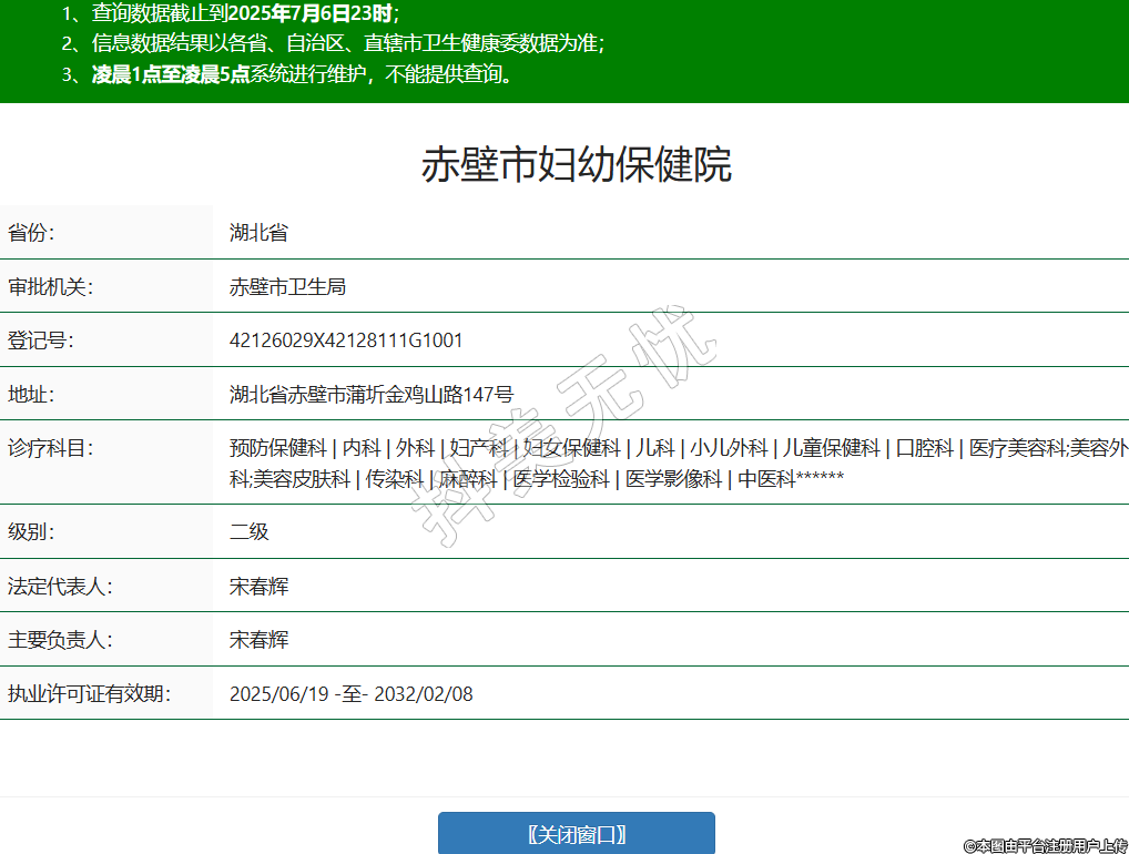 省份:湖北省審批機關(guān):赤壁市衛(wèi)生局登記號:42126029X42128111G1001地址:湖北省赤壁市蒲圻金雞山路147號診療科目:預(yù)防保健科 | 內(nèi)科 | 外科 | 婦產(chǎn)科 | 婦女保健科 | 兒科 | 小兒外科 | 兒童保健科 | 口腔科 | 醫(yī)療美容科;美容外科;美容皮膚科 | 傳染科 | 麻醉科 | 醫(yī)學(xué)檢驗科 | 醫(yī)學(xué)影像科 | 中醫(yī)科******級別:二級法定代表人:宋春輝主要負責(zé)人:宋春輝執(zhí)業(yè)許可證有效期:2025/06/19 -至- 2032/02/08 -