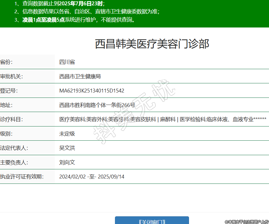 西昌韓美醫(yī)療美容門診部,診療科目:醫(yī)療美容科;美容外科;美容牙科;美容皮膚科 | 麻醉科 | 醫(yī)學(xué)檢驗(yàn)科;臨床體液、血液專業(yè)******