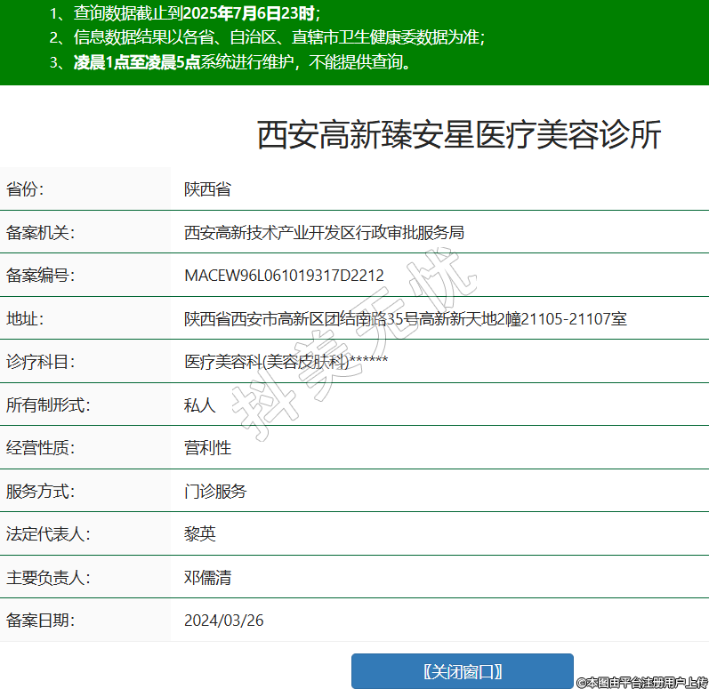 省份:陜西省備案機(jī)關(guān):西安高新技術(shù)產(chǎn)業(yè)開(kāi)發(fā)區(qū)行政審批服務(wù)局備案編號(hào):MACEW96L061019317D2212地址:陜西省西安市高新區(qū)團(tuán)結(jié)南路35號(hào)高新新天地2幢21105-21107室診療科目:醫(yī)療美容科(美容皮膚科)******所有制形式:私人經(jīng)營(yíng)性質(zhì):營(yíng)利性服務(wù)方式:門(mén)診服務(wù)法定代表人:黎英主要負(fù)責(zé)人:鄧儒清備案日期:2024/03/26 -