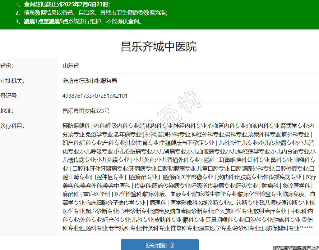 省份:山東省審批機關:濰坊市行政審批服務局登記號:49387617337072519A2101地址:昌樂縣恒安街323號診療科目:預防保健科 | 內科;呼吸內科專業(yè);消化內科專業(yè);神經內科專業(yè);心血管內科專業(yè);血液內科專業(yè);腎病學專業(yè);內分泌專業(yè);免疫學專業(yè);老年病專業(yè) | 外科;普通外科專業(yè);神經外科專業(yè);骨科專業(yè);泌尿外科專業(yè);胸外科專業(yè) | 婦產科;婦科專業(yè);產科專業(yè);計劃生育專業(yè);生殖健康與不孕癥專業(yè) | 兒科;新生兒專業(yè);小兒傳染病專業(yè);小兒消化專業(yè);小兒呼吸專業(yè);小兒心臟病專業(yè);小兒腎病專業(yè);小兒血液病專業(yè);小兒神經病學專業(yè);小兒內分泌專業(yè);小兒遺傳病專業(yè);小兒免疫專業(yè) | 小兒外科;小兒普通外科專業(yè) | 眼科 | 耳鼻咽喉科;耳科專業(yè);鼻科專業(yè);咽喉科專業(yè) | 口腔科;牙體牙髓病專業(yè);牙周病專業(yè);口腔粘膜病專業(yè);兒童口腔專業(yè);口腔頜面外科專業(yè);口腔修復專業(yè);口腔正畸專業(yè);口腔種植專業(yè);口腔麻醉專業(yè);口腔頜面醫(yī)學影像專業(yè) | 皮膚科;皮膚病專業(yè);性傳播疾病專業(yè) | 醫(yī)療美容科;美容外科;美容中醫(yī)科 | 傳染科;腸道傳染病專業(yè);呼吸道傳染病專業(yè);肝炎專業(yè) | 腫瘤科 | 急診醫(yī)學科 | 麻醉科 | 重癥醫(yī)學科 | 醫(yī)學檢驗科;臨床體液、血液專業(yè);臨床微生物學專業(yè);臨床化學檢驗專業(yè);臨床免疫、血清學專業(yè);臨床細胞分子遺傳學專業(yè) | 病理科 | 醫(yī)學影像科;X線診斷專業(yè);CT診斷專業(yè);磁共振成像診斷專業(yè);核醫(yī)學專業(yè);超聲診斷專業(yè);心電診斷專業(yè);腦電及腦血流圖診斷專業(yè);介入放射學專業(yè);放射治療專業(yè) | 中醫(yī)科;內科專業(yè);外科專業(yè);婦產科專業(yè);兒科專業(yè);皮膚科專業(yè);眼科專業(yè);耳鼻咽喉科專業(yè);口腔科專業(yè);腫瘤科專業(yè);骨傷科專業(yè);肛腸科專業(yè);老年病科專業(yè);針灸科專業(yè);推拿科專業(yè);康復醫(yī)學專業(yè);急診科專業(yè);預防保健科專業(yè)******級別:二級法定代表人:孔祥民主要負責人:李連印執(zhí)業(yè)許可證有效期:2024/05/09 -至- 2036/03/13 -