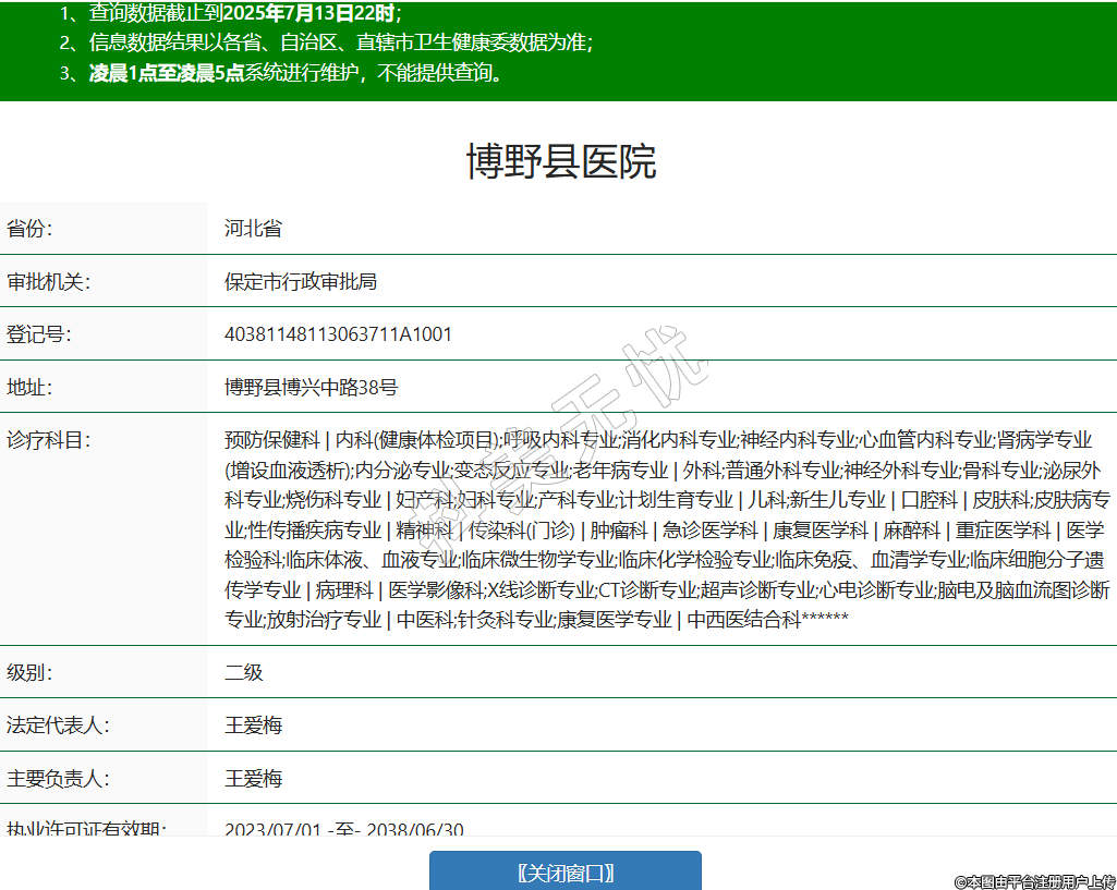 省份:河北省審批機關(guān):保定市行政審批局登記號:40381148113063711A1001地址:博野縣博興中路38號診療科目:預防保健科 | 內(nèi)科(健康體檢項目);呼吸內(nèi)科專業(yè);消化內(nèi)科專業(yè);神經(jīng)內(nèi)科專業(yè);心血管內(nèi)科專業(yè);腎病學專業(yè)(增設(shè)血液透析);內(nèi)分泌專業(yè);變態(tài)反應(yīng)專業(yè);老年病專業(yè) | 外科;普通外科專業(yè);神經(jīng)外科專業(yè);骨科專業(yè);泌尿外科專業(yè);燒傷科專業(yè) | 婦產(chǎn)科;婦科專業(yè);產(chǎn)科專業(yè);計劃生育專業(yè) | 兒科;新生兒專業(yè) | 口腔科 | 皮膚科;皮膚病專業(yè);性傳播疾病專業(yè) | 精神科 | 傳染科(門診) | 腫瘤科 | 急診醫(yī)學科 | 康復醫(yī)學科 | 麻醉科 | 重癥醫(yī)學科 | 醫(yī)學檢驗科;臨床體液、血液專業(yè);臨床微生物學專業(yè);臨床化學檢驗專業(yè);臨床免疫、血清學專業(yè);臨床細胞分子遺傳學專業(yè) | 病理科 | 醫(yī)學影像科;X線診斷專業(yè);CT診斷專業(yè);超聲診斷專業(yè);心電診斷專業(yè);腦電及腦血流圖診斷專業(yè);放射治療專業(yè) | 中醫(yī)科;針灸科專業(yè);康復醫(yī)學專業(yè) | 中西醫(yī)結(jié)合科******級別:二級法定代表人:王愛梅主要負責人:王愛梅執(zhí)業(yè)許可證有效期:2023/07/01 -至- 2038/06/30 -