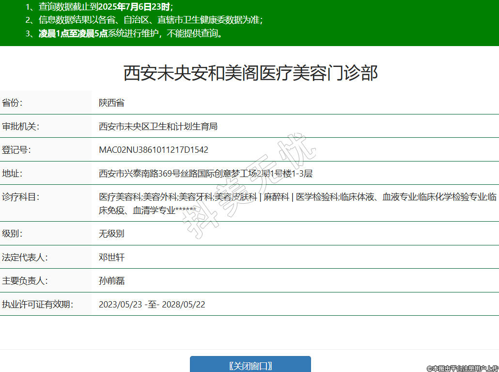 省份:陜西省審批機(jī)關(guān):西安市未央?yún)^(qū)衛(wèi)生和計(jì)劃生育局登記號(hào):MAC02NU3861011217D1542地址:西安市興泰南路369號(hào)絲路國(guó)際創(chuàng)意夢(mèng)工場(chǎng)2期1號(hào)樓1-3層診療科目:醫(yī)療美容科;美容外科;美容牙科;美容皮膚科 | 麻醉科 | 醫(yī)學(xué)檢驗(yàn)科;臨床體液、血液專業(yè);臨床化學(xué)檢驗(yàn)專業(yè);臨床免疫、血清學(xué)專業(yè)******級(jí)別:無級(jí)別法定代表人:鄧世軒主要負(fù)責(zé)人:孫前磊執(zhí)業(yè)許可證有效期:2023/05/23 -至- 2028/05/22 -