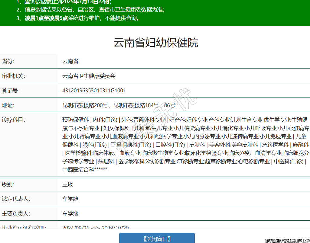 省份:云南省審批機(jī)關(guān):云南省衛(wèi)生健康委員會登記號:43120196353010311G1001地址:昆明市鼓樓路200號、昆明市鼓樓路184號、86號診療科目:預(yù)防保健科 | 內(nèi)科(門診) | 外科;普通外科專業(yè) | 婦產(chǎn)科;婦科專業(yè);產(chǎn)科專業(yè);計劃生育專業(yè);優(yōu)生學(xué)專業(yè);生殖健康與不孕癥專業(yè) | 婦女保健科 | 兒科;新生兒專業(yè);小兒傳染病專業(yè);小兒消化專業(yè);小兒呼吸專業(yè);小兒心臟病專業(yè);小兒腎病專業(yè);小兒血液病專業(yè);小兒神經(jīng)病學(xué)專業(yè);小兒內(nèi)分泌專業(yè);小兒遺傳病專業(yè);小兒免疫專業(yè) | 兒童保健科 | 眼科(門診) | 耳鼻咽喉科(門診) | 口腔科(門診) | 皮膚科 | 美容外科;美容皮膚科 | 急診醫(yī)學(xué)科 | 麻醉科 | 醫(yī)學(xué)檢驗科;臨床體液、血液專業(yè);臨床微生物學(xué)專業(yè);臨床化學(xué)檢驗專業(yè);臨床免疫、血清學(xué)專業(yè);臨床細(xì)胞分子遺傳學(xué)專業(yè) | 病理科 | 醫(yī)學(xué)影像科;X線診斷專業(yè);CT診斷專業(yè);超聲診斷專業(yè);心電診斷專業(yè) | 中醫(yī)科(門診) | 中西醫(yī)結(jié)合科******級別:三級法定代表人:車學(xué)繼主要負(fù)責(zé)人:車學(xué)繼執(zhí)業(yè)許可證有效期:2024/09/26 -至- 2039/10/20 -