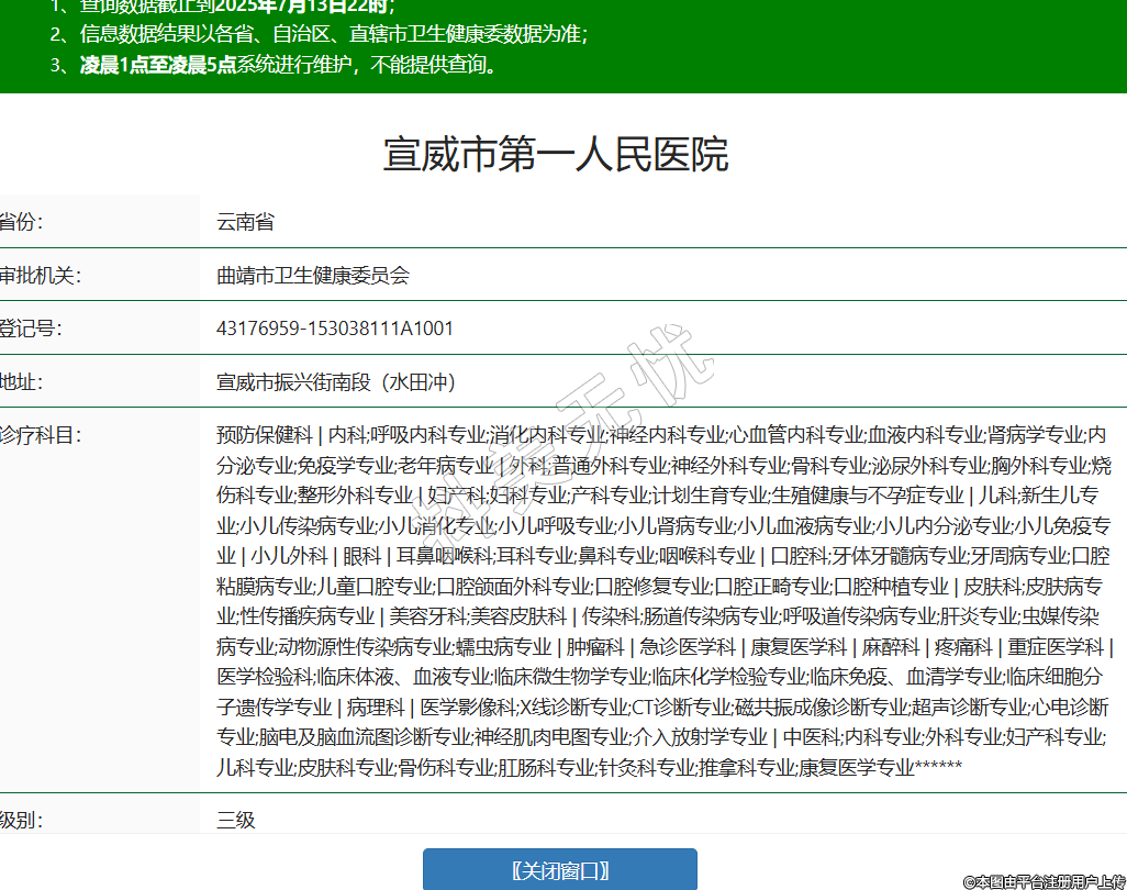 省份:云南省審批機(jī)關(guān):曲靖市衛(wèi)生健康委員會登記號:43176959-153038111A1001地址:宣威市振興街南段(水田沖)診療科目:預(yù)防保健科 | 內(nèi)科;呼吸內(nèi)科專業(yè);消化內(nèi)科專業(yè);神經(jīng)內(nèi)科專業(yè);心血管內(nèi)科專業(yè);血液內(nèi)科專業(yè);腎病學(xué)專業(yè);內(nèi)分泌專業(yè);免疫學(xué)專業(yè);老年病專業(yè) | 外科;普通外科專業(yè);神經(jīng)外科專業(yè);骨科專業(yè);泌尿外科專業(yè);胸外科專業(yè);燒傷科專業(yè);整形外科專業(yè) | 婦產(chǎn)科;婦科專業(yè);產(chǎn)科專業(yè);計(jì)劃生育專業(yè);生殖健康與不孕癥專業(yè) | 兒科;新生兒專業(yè);小兒傳染病專業(yè);小兒消化專業(yè);小兒呼吸專業(yè);小兒腎病專業(yè);小兒血液病專業(yè);小兒內(nèi)分泌專業(yè);小兒免疫專業(yè) | 小兒外科 | 眼科 | 耳鼻咽喉科;耳科專業(yè);鼻科專業(yè);咽喉科專業(yè) | 口腔科;牙體牙髓病專業(yè);牙周病專業(yè);口腔粘膜病專業(yè);兒童口腔專業(yè);口腔頜面外科專業(yè);口腔修復(fù)專業(yè);口腔正畸專業(yè);口腔種植專業(yè) | 皮膚科;皮膚病專業(yè);性傳播疾病專業(yè) | 美容牙科;美容皮膚科 | 傳染科;腸道傳染病專業(yè);呼吸道傳染病專業(yè);肝炎專業(yè);蟲媒傳染病專業(yè);動物源性傳染病專業(yè);蠕蟲病專業(yè) | 腫瘤科 | 急診醫(yī)學(xué)科 | 康復(fù)醫(yī)學(xué)科 | 麻醉科 | 疼痛科 | 重癥醫(yī)學(xué)科 | 醫(yī)學(xué)檢驗(yàn)科;臨床體液、血液專業(yè);臨床微生物學(xué)專業(yè);臨床化學(xué)檢驗(yàn)專業(yè);臨床免疫、血清學(xué)專業(yè);臨床細(xì)胞分子遺傳學(xué)專業(yè) | 病理科 | 醫(yī)學(xué)影像科;X線診斷專業(yè);CT診斷專業(yè);磁共振成像診斷專業(yè);超聲診斷專業(yè);心電診斷專業(yè);腦電及腦血流圖診斷專業(yè);神經(jīng)肌肉電圖專業(yè);介入放射學(xué)專業(yè) | 中醫(yī)科;內(nèi)科專業(yè);外科專業(yè);婦產(chǎn)科專業(yè);兒科專業(yè);皮膚科專業(yè);骨傷科專業(yè);肛腸科專業(yè);針灸科專業(yè);推拿科專業(yè);康復(fù)醫(yī)學(xué)專業(yè)******級別:三級法定代表人:薛武憲主要負(fù)責(zé)人:薛武憲執(zhí)業(yè)許可證有效期:2020/04/16 -至- 2035/04/15 -