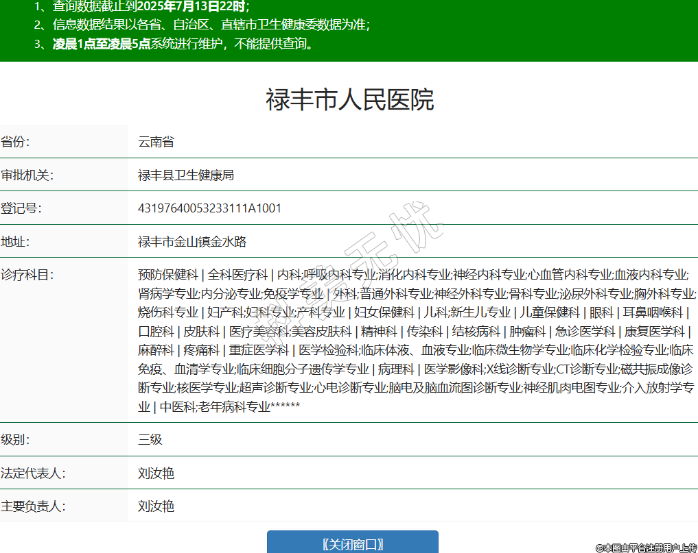 省份:云南省審批機(jī)關(guān):祿豐縣衛(wèi)生健康局登記號(hào):43197640053233111A1001地址:祿豐市金山鎮(zhèn)金水路診療科目:預(yù)防保健科 | 全科醫(yī)療科 | 內(nèi)科;呼吸內(nèi)科專業(yè);消化內(nèi)科專業(yè);神經(jīng)內(nèi)科專業(yè);心血管內(nèi)科專業(yè);血液內(nèi)科專業(yè);腎病學(xué)專業(yè);內(nèi)分泌專業(yè);免疫學(xué)專業(yè) | 外科;普通外科專業(yè);神經(jīng)外科專業(yè);骨科專業(yè);泌尿外科專業(yè);胸外科專業(yè);燒傷科專業(yè) | 婦產(chǎn)科;婦科專業(yè);產(chǎn)科專業(yè) | 婦女保健科 | 兒科;新生兒專業(yè) | 兒童保健科 | 眼科 | 耳鼻咽喉科 | 口腔科 | 皮膚科 | 醫(yī)療美容科;美容皮膚科 | 精神科 | 傳染科 | 結(jié)核病科 | 腫瘤科 | 急診醫(yī)學(xué)科 | 康復(fù)醫(yī)學(xué)科 | 麻醉科 | 疼痛科 | 重癥醫(yī)學(xué)科 | 醫(yī)學(xué)檢驗(yàn)科;臨床體液、血液專業(yè);臨床微生物學(xué)專業(yè);臨床化學(xué)檢驗(yàn)專業(yè);臨床免疫、血清學(xué)專業(yè);臨床細(xì)胞分子遺傳學(xué)專業(yè) | 病理科 | 醫(yī)學(xué)影像科;X線診斷專業(yè);CT診斷專業(yè);磁共振成像診斷專業(yè);核醫(yī)學(xué)專業(yè);超聲診斷專業(yè);心電診斷專業(yè);腦電及腦血流圖診斷專業(yè);神經(jīng)肌肉電圖專業(yè);介入放射學(xué)專業(yè) | 中醫(yī)科;老年病科專業(yè)******級(jí)別:三級(jí)法定代表人:劉汝艷主要負(fù)責(zé)人:劉汝艷執(zhí)業(yè)許可證有效期:2023/09/15 -至- 2037/12/30 -