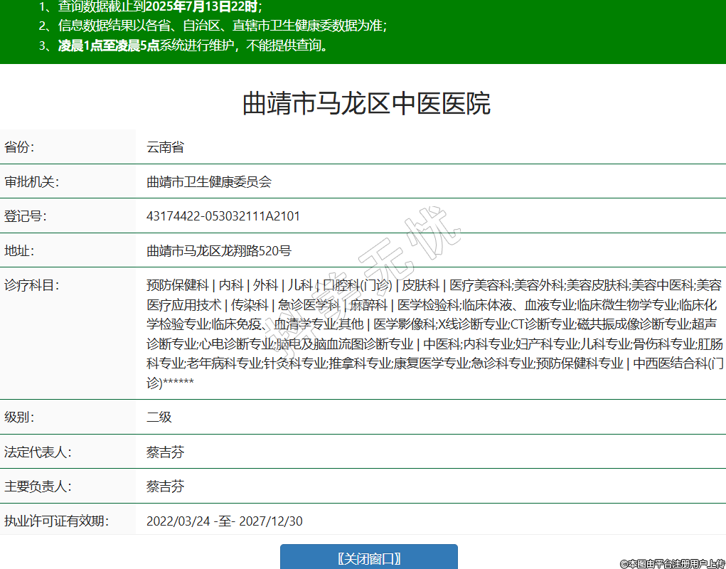 省份:云南省審批機(jī)關(guān):曲靖市衛(wèi)生健康委員會登記號:43174422-053032111A2101地址:曲靖市馬龍區(qū)龍翔路520號診療科目:預(yù)防保健科 | 內(nèi)科 | 外科 | 兒科 | 口腔科(門診) | 皮膚科 | 醫(yī)療美容科;美容外科;美容皮膚科;美容中醫(yī)科;美容醫(yī)療應(yīng)用技術(shù) | 傳染科 | 急診醫(yī)學(xué)科 | 麻醉科 | 醫(yī)學(xué)檢驗(yàn)科;臨床體液、血液專業(yè);臨床微生物學(xué)專業(yè);臨床化學(xué)檢驗(yàn)專業(yè);臨床免疫、血清學(xué)專業(yè);其他 | 醫(yī)學(xué)影像科;X線診斷專業(yè);CT診斷專業(yè);磁共振成像診斷專業(yè);超聲診斷專業(yè);心電診斷專業(yè);腦電及腦血流圖診斷專業(yè) | 中醫(yī)科;內(nèi)科專業(yè);婦產(chǎn)科專業(yè);兒科專業(yè);骨傷科專業(yè);肛腸科專業(yè);老年病科專業(yè);針灸科專業(yè);推拿科專業(yè);康復(fù)醫(yī)學(xué)專業(yè);急診科專業(yè);預(yù)防保健科專業(yè) | 中西醫(yī)結(jié)合科(門診)******級別:二級法定代表人:蔡吉芬主要負(fù)責(zé)人:蔡吉芬執(zhí)業(yè)許可證有效期:2022/03/24 -至- 2027/12/30 -
