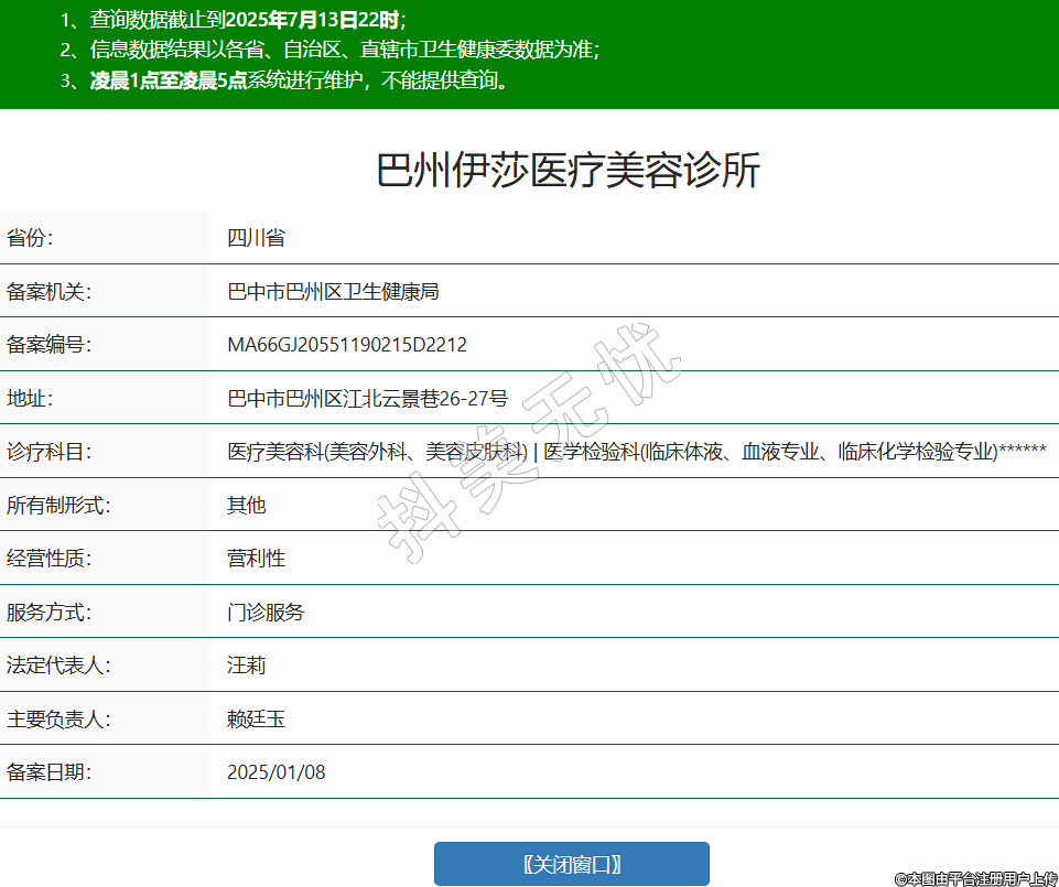 省份:四川省備案機關:巴中市巴州區(qū)衛(wèi)生健康局備案編號:MA66GJ20551190215D2212地址:巴中市巴州區(qū)江北云景巷26-27號診療科目:醫(yī)療美容科(美容外科、美容皮膚科) | 醫(yī)學檢驗科(臨床體液、血液專業(yè)、臨床化學檢驗專業(yè))******所有制形式:其他經(jīng)營性質(zhì):營利性服務方式:門診服務法定代表人:汪莉主要負責人:賴廷玉備案日期:2025/01/08 -