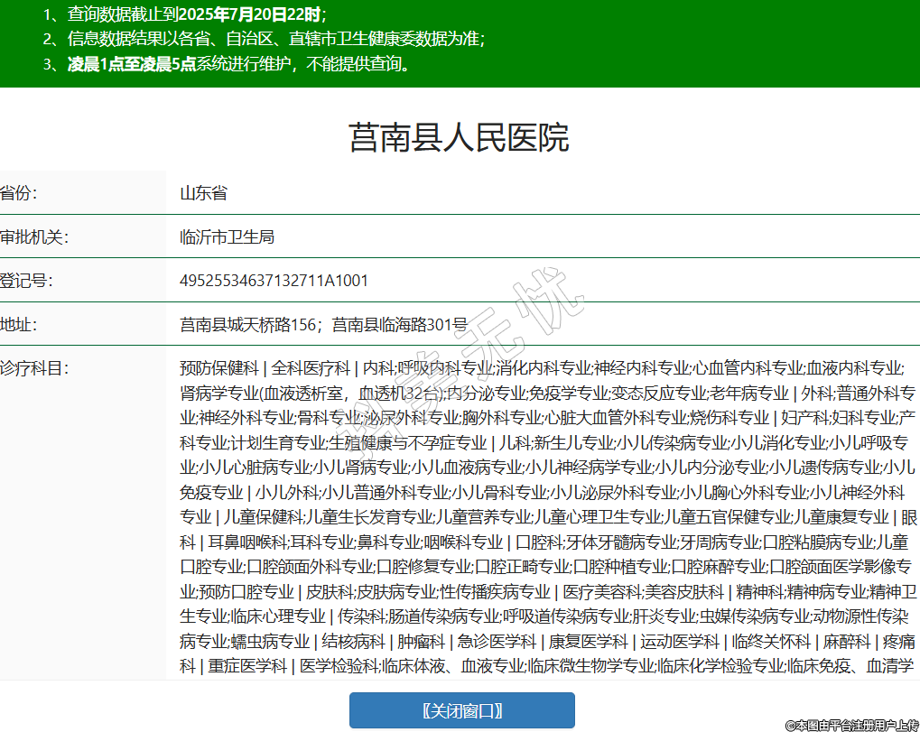 省份:山東省審批機(jī)關(guān):臨沂市衛(wèi)生局登記號(hào):49525534637132711A1001地址:莒南縣城天橋路156;莒南縣臨海路301號(hào)診療科目:預(yù)防保健科 | 全科醫(yī)療科 | 內(nèi)科;呼吸內(nèi)科專業(yè);消化內(nèi)科專業(yè);神經(jīng)內(nèi)科專業(yè);心血管內(nèi)科專業(yè);血液內(nèi)科專業(yè);腎病學(xué)專業(yè)(血液透析室,血透機(jī)32臺(tái));內(nèi)分泌專業(yè);免疫學(xué)專業(yè);變態(tài)反應(yīng)專業(yè);老年病專業(yè) | 外科;普通外科專業(yè);神經(jīng)外科專業(yè);骨科專業(yè);泌尿外科專業(yè);胸外科專業(yè);心臟大血管外科專業(yè);燒傷科專業(yè) | 婦產(chǎn)科;婦科專業(yè);產(chǎn)科專業(yè);計(jì)劃生育專業(yè);生殖健康與不孕癥專業(yè) | 兒科;新生兒專業(yè);小兒傳染病專業(yè);小兒消化專業(yè);小兒呼吸專業(yè);小兒心臟病專業(yè);小兒腎病專業(yè);小兒血液病專業(yè);小兒神經(jīng)病學(xué)專業(yè);小兒內(nèi)分泌專業(yè);小兒遺傳病專業(yè);小兒免疫專業(yè) | 小兒外科;小兒普通外科專業(yè);小兒骨科專業(yè);小兒泌尿外科專業(yè);小兒胸心外科專業(yè);小兒神經(jīng)外科專業(yè) | 兒童保健科;兒童生長(zhǎng)發(fā)育專業(yè);兒童營(yíng)養(yǎng)專業(yè);兒童心理衛(wèi)生專業(yè);兒童五官保健專業(yè);兒童康復(fù)專業(yè) | 眼科 | 耳鼻咽喉科;耳科專業(yè);鼻科專業(yè);咽喉科專業(yè) | 口腔科;牙體牙髓病專業(yè);牙周病專業(yè);口腔粘膜病專業(yè);兒童口腔專業(yè);口腔頜面外科專業(yè);口腔修復(fù)專業(yè);口腔正畸專業(yè);口腔種植專業(yè);口腔麻醉專業(yè);口腔頜面醫(yī)學(xué)影像專業(yè);預(yù)防口腔專業(yè) | 皮膚科;皮膚病專業(yè);性傳播疾病專業(yè) | 醫(yī)療美容科;美容皮膚科 | 精神科;精神病專業(yè);精神衛(wèi)生專業(yè);臨床心理專業(yè) | 傳染科;腸道傳染病專業(yè);呼吸道傳染病專業(yè);肝炎專業(yè);蟲媒傳染病專業(yè);動(dòng)物源性傳染病專業(yè);蠕蟲病專業(yè) | 結(jié)核病科 | 腫瘤科 | 急診醫(yī)學(xué)科 | 康復(fù)醫(yī)學(xué)科 | 運(yùn)動(dòng)醫(yī)學(xué)科 | 臨終關(guān)懷科 | 麻醉科 | 疼痛科 | 重癥醫(yī)學(xué)科 | 醫(yī)學(xué)檢驗(yàn)科;臨床體液、血液專業(yè);臨床微生物學(xué)專業(yè);臨床化學(xué)檢驗(yàn)專業(yè);臨床免疫、血清學(xué)專業(yè);臨床細(xì)胞分子遺傳學(xué)專業(yè) | 病理科 | 醫(yī)學(xué)影像科;X線診斷專業(yè);CT診斷專業(yè);磁共振成像診斷專業(yè);超聲診斷專業(yè);心電診斷專業(yè);腦電及腦血流圖診斷專業(yè);神經(jīng)肌肉電圖專業(yè);介入放射學(xué)專業(yè);放射治療專業(yè) | 中醫(yī)科;內(nèi)科專業(yè);外科專業(yè);婦產(chǎn)科專業(yè);兒科專業(yè);骨傷科專業(yè);肛腸科專業(yè);針灸科專業(yè);推拿科專業(yè);康復(fù)醫(yī)學(xué)專業(yè)******級(jí)別:二級(jí)法定代表人:李長(zhǎng)慶主要負(fù)責(zé)人:李長(zhǎng)慶執(zhí)業(yè)許可證有效期:2025/02/05 -至- 2029/12/31 -