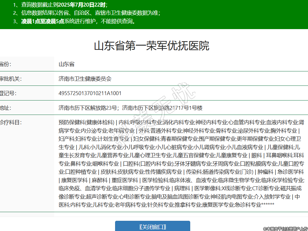 省份:山東省審批機關(guān):濟南市衛(wèi)生健康委員會登記號:49557250137010211A1001地址:濟南市歷下區(qū)解放路23號;濟南市歷下區(qū)旅游路21717號1號樓診療科目:預(yù)防保健科(健康體檢科) | 內(nèi)科;呼吸內(nèi)科專業(yè);消化內(nèi)科專業(yè);神經(jīng)內(nèi)科專業(yè);心血管內(nèi)科專業(yè);血液內(nèi)科專業(yè);腎病學(xué)專業(yè);內(nèi)分泌專業(yè);老年病專業(yè) | 外科;普通外科專業(yè);神經(jīng)外科專業(yè);骨科專業(yè);泌尿外科專業(yè);胸外科專業(yè) | 婦產(chǎn)科;婦科專業(yè);計劃生育專業(yè) | 婦女保健科;青春期保健專業(yè);圍產(chǎn)期保健專業(yè);更年期保健專業(yè);婦女心理衛(wèi)生專業(yè) | 兒科;小兒消化專業(yè);小兒呼吸專業(yè);小兒心臟病專業(yè);小兒腎病專業(yè);小兒血液病專業(yè) | 兒童保健科;兒童生長發(fā)育專業(yè);兒童營養(yǎng)專業(yè);兒童心理衛(wèi)生專業(yè);兒童五官保健專業(yè);兒童康復(fù)專業(yè) | 眼科 | 耳鼻咽喉科;耳科專業(yè);鼻科專業(yè);咽喉科專業(yè) | 口腔科(口腔內(nèi)科專業(yè));牙體牙髓病專業(yè);牙周病專業(yè);口腔粘膜病專業(yè);兒童口腔專業(yè);口腔種植專業(yè) | 皮膚科;皮膚病專業(yè);性傳播疾病專業(yè) | 傳染科;腸道傳染病專業(yè)(門診) | 腫瘤科 | 急診醫(yī)學(xué)科 | 康復(fù)醫(yī)學(xué)科 | 麻醉科 | 重癥醫(yī)學(xué)科 | 醫(yī)學(xué)檢驗科;臨床體液、血液專業(yè);臨床微生物學(xué)專業(yè);臨床化學(xué)檢驗專業(yè);臨床免疫、血清學(xué)專業(yè);臨床細胞分子遺傳學(xué)專業(yè) | 病理科 | 醫(yī)學(xué)影像科;X線診斷專業(yè);CT診斷專業(yè);磁共振成像診斷專業(yè);超聲診斷專業(yè);心電診斷專業(yè);腦電及腦血流圖診斷專業(yè);神經(jīng)肌肉電圖專業(yè);介入放射學(xué)專業(yè) | 中醫(yī)科;內(nèi)科專業(yè);兒科專業(yè);老年病科專業(yè);針灸科專業(yè);推拿科專業(yè);康復(fù)醫(yī)學(xué)專業(yè);急診科專業(yè)******級別:二級法定代表人:孫士營主要負責人:孫士營執(zhí)業(yè)許可證有效期:2025/03/11 -至- 2033/10/23 -
