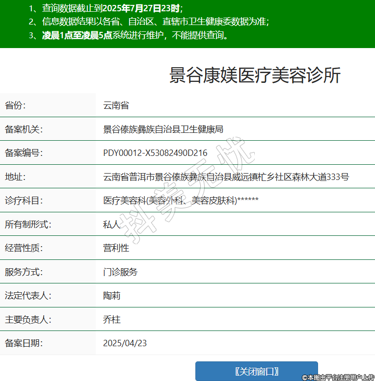 省份:云南省備案機關(guān):景谷傣族彝族自治縣衛(wèi)生健康局備案編號:PDY00012-X53082490D216地址:云南省普洱市景谷傣族彝族自治縣威遠鎮(zhèn)杧鄉(xiāng)社區(qū)森林大道333號診療科目:醫(yī)療美容科(美容外科、美容皮膚科)******所有制形式:私人經(jīng)營性質(zhì):營利性服務(wù)方式:門診服務(wù)法定代表人:陶莉主要負(fù)責(zé)人:喬柱備案日期:2025/04/23 -