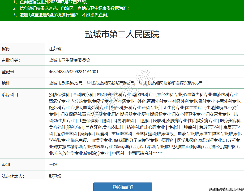 省份:江蘇省審批機(jī)關(guān):鹽城市衛(wèi)生健康委員會(huì)登記號(hào):46824884532092811A1001地址:鹽城市劇場(chǎng)路75號(hào)、鹽城市鹽都區(qū)新都西路2號(hào)、鹽城市鹽都區(qū)鹽龍街道振興路166號(hào)診療科目:預(yù)防保健科 | 全科醫(yī)療科 | 內(nèi)科;呼吸內(nèi)科專業(yè);消化內(nèi)科專業(yè);神經(jīng)內(nèi)科專業(yè);心血管內(nèi)科專業(yè);血液內(nèi)科專業(yè);腎病學(xué)專業(yè);內(nèi)分泌專業(yè);免疫學(xué)專業(yè);老年病專業(yè) | 外科;普通外科專業(yè);神經(jīng)外科專業(yè);骨科專業(yè);泌尿外科專業(yè);胸外科專業(yè);心臟大血管外科專業(yè) | 婦產(chǎn)科;婦科專業(yè);產(chǎn)科專業(yè);計(jì)劃生育專業(yè);優(yōu)生學(xué)專業(yè);生殖健康與不孕癥專業(yè) | 婦女保健科;青春期保健專業(yè);圍產(chǎn)期保健專業(yè);更年期保健專業(yè);婦女心理衛(wèi)生專業(yè);婦女營(yíng)養(yǎng)專業(yè) | 兒科;新生兒專業(yè) | 兒童保健科 | 眼科 | 耳鼻咽喉科 | 口腔科 | 皮膚科;皮膚病專業(yè);性傳播疾病專業(yè) | 醫(yī)療美容科;美容外科(眼科方向);美容牙科;美容皮膚科 | 精神科;臨床心理專業(yè) | 傳染科 | 腫瘤科 | 急診醫(yī)學(xué)科 | 康復(fù)醫(yī)學(xué)科 | 運(yùn)動(dòng)醫(yī)學(xué)科 | 麻醉科 | 疼痛科 | 重癥醫(yī)學(xué)科 | 醫(yī)學(xué)檢驗(yàn)科;臨床體液、血液專業(yè);臨床微生物學(xué)專業(yè);臨床化學(xué)檢驗(yàn)專業(yè);臨床免疫、血清學(xué)專業(yè);臨床細(xì)胞分子遺傳學(xué)專業(yè) | 病理科 | 醫(yī)學(xué)影像科;X線診斷專業(yè);CT診斷專業(yè);磁共振成像診斷專業(yè);核醫(yī)學(xué)專業(yè);超聲診斷專業(yè);心電診斷專業(yè);腦電及腦血流圖診斷專業(yè);神經(jīng)肌肉電圖專業(yè);介入放射學(xué)專業(yè);放射治療專業(yè) | 中醫(yī)科 | 中西醫(yī)結(jié)合科******級(jí)別:三級(jí)法定代表人:戴真煜主要負(fù)責(zé)人:戴真煜執(zhí)業(yè)許可證有效期:2021/12/18 -至- 2036/12/18 -
