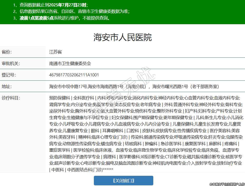 省份:江蘇省審批機關:南通市衛(wèi)生健康委員會登記號:46798177032062111A1001地址:海安市中壩中路17號,海安市海南西路1號(海南分院),海安市曙光西路1號(老干部醫(yī)務室)診療科目:預防保健科 | 全科醫(yī)療科 | 內科;呼吸內科專業(yè);消化內科專業(yè);神經內科專業(yè);心血管內科專業(yè);血液內科專業(yè);腎病學專業(yè);內分泌專業(yè);免疫學專業(yè);變態(tài)反應專業(yè);老年病專業(yè) | 外科;普通外科專業(yè);神經外科專業(yè);骨科專業(yè);泌尿外科專業(yè);胸外科專業(yè);心臟大血管外科專業(yè);燒傷科專業(yè);整形外科專業(yè) | 婦產科;婦科專業(yè);產科專業(yè);計劃生育專業(yè);生殖健康與不孕癥專業(yè) | 婦女保健科;圍產期保健專業(yè);更年期保健專業(yè) | 兒科;新生兒專業(yè);小兒消化專業(yè);小兒呼吸專業(yè);小兒腎病專業(yè);小兒血液病專業(yè);小兒內分泌專業(yè) | 兒童保健科;兒童生長發(fā)育專業(yè);兒童營養(yǎng)專業(yè);兒童康復專業(yè) | 眼科 | 耳鼻咽喉科 | 口腔科 | 皮膚科;皮膚病專業(yè);性傳播疾病專業(yè) | 醫(yī)療美容科;美容外科;美容牙科 | 精神科;臨床心理專業(yè)(門診) | 傳染科;腸道傳染病專業(yè);呼吸道傳染病專業(yè);肝炎專業(yè);蟲媒傳染病專業(yè);動物源性傳染病專業(yè);蠕蟲病專業(yè) | 結核病科 | 腫瘤科 | 急診醫(yī)學科 | 康復醫(yī)學科 | 麻醉科 | 疼痛科 | 重癥醫(yī)學科 | 醫(yī)學檢驗科;臨床體液、血液專業(yè);臨床微生物學專業(yè);臨床化學檢驗專業(yè);臨床免疫、血清學專業(yè);臨床細胞分子遺傳學專業(yè) | 病理科 | 醫(yī)學影像科;X線診斷專業(yè);CT診斷專業(yè);磁共振成像診斷專業(yè);核醫(yī)學專業(yè);超聲診斷專業(yè);心電診斷專業(yè);腦電及腦血流圖診斷專業(yè);神經肌肉電圖專業(yè);介入放射學專業(yè);放射治療專業(yè) | 中醫(yī)科 | 中西醫(yī)結合科(門診)******級別:三級法定代表人:吉華亮主要負責人:呂書軍執(zhí)業(yè)許可證有效期:2022/08/22 -至- 2036/03/19 -
