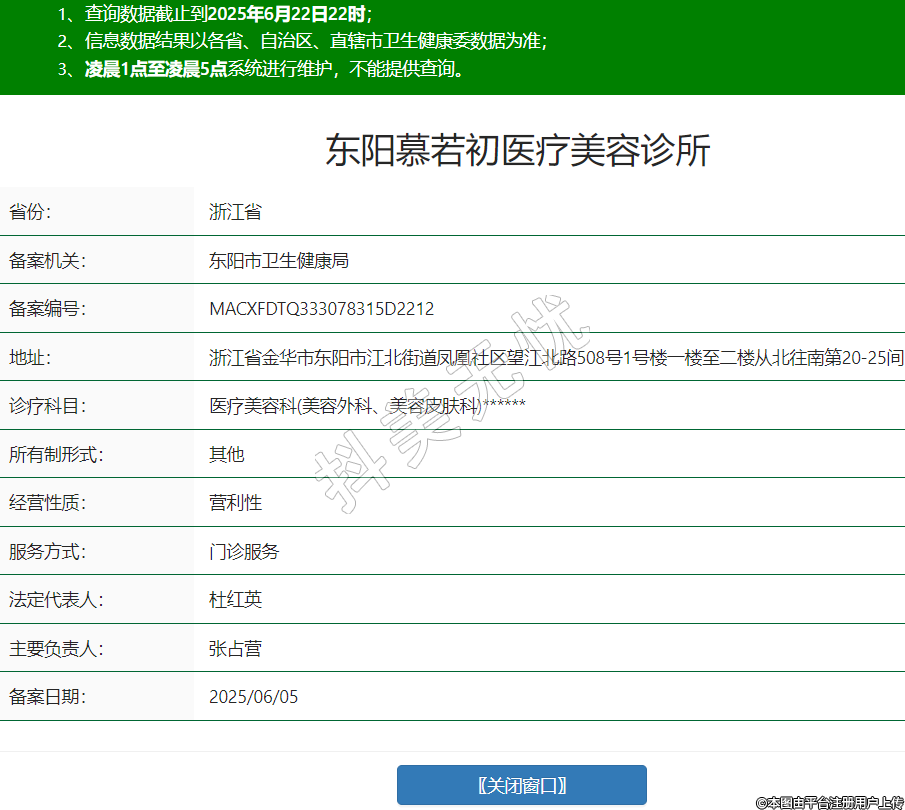 省份:浙江省備案機關(guān):東陽市衛(wèi)生健康局備案編號:MACXFDTQ333078315D2212地址:浙江省金華市東陽市江北街道鳳凰社區(qū)望江北路508號1號樓一樓至二樓從北往南第20-25間診療科目:醫(yī)療美容科(美容外科、美容皮膚科)******所有制形式:其他經(jīng)營性質(zhì):營利性服務(wù)方式:門診服務(wù)法定代表人:杜紅英主要負責人:張占營備案日期:2025/06/05 -