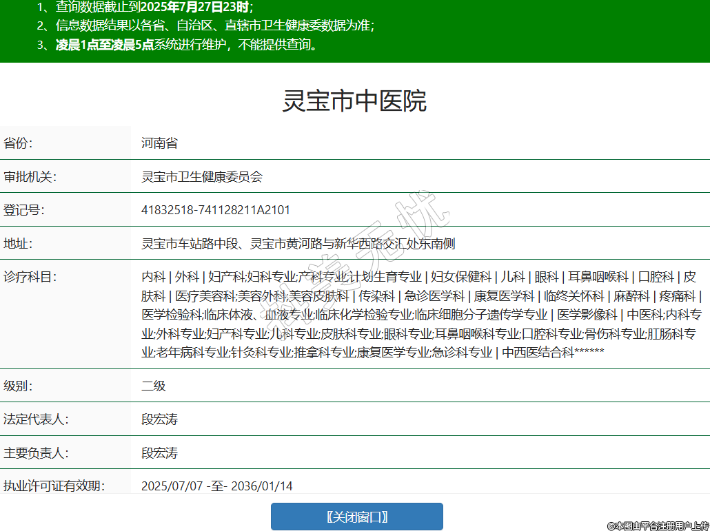 省份:河南省審批機關:靈寶市衛(wèi)生健康委員會登記號:41832518-741128211A2101地址:靈寶市車站路中段、靈寶市黃河路與新華西路交匯處東南側診療科目:內科 | 外科 | 婦產(chǎn)科;婦科專業(yè);產(chǎn)科專業(yè);計劃生育專業(yè) | 婦女保健科 | 兒科 | 眼科 | 耳鼻咽喉科 | 口腔科 | 皮膚科 | 醫(yī)療美容科;美容外科;美容皮膚科 | 傳染科 | 急診醫(yī)學科 | 康復醫(yī)學科 | 臨終關懷科 | 麻醉科 | 疼痛科 | 醫(yī)學檢驗科;臨床體液、血液專業(yè);臨床化學檢驗專業(yè);臨床細胞分子遺傳學專業(yè) | 醫(yī)學影像科 | 中醫(yī)科;內科專業(yè);外科專業(yè);婦產(chǎn)科專業(yè);兒科專業(yè);皮膚科專業(yè);眼科專業(yè);耳鼻咽喉科專業(yè);口腔科專業(yè);骨傷科專業(yè);肛腸科專業(yè);老年病科專業(yè);針灸科專業(yè);推拿科專業(yè);康復醫(yī)學專業(yè);急診科專業(yè) | 中西醫(yī)結合科******級別:二級法定代表人:段宏濤主要負責人:段宏濤執(zhí)業(yè)許可證有效期:2025/07/07 -至- 2036/01/14 -
