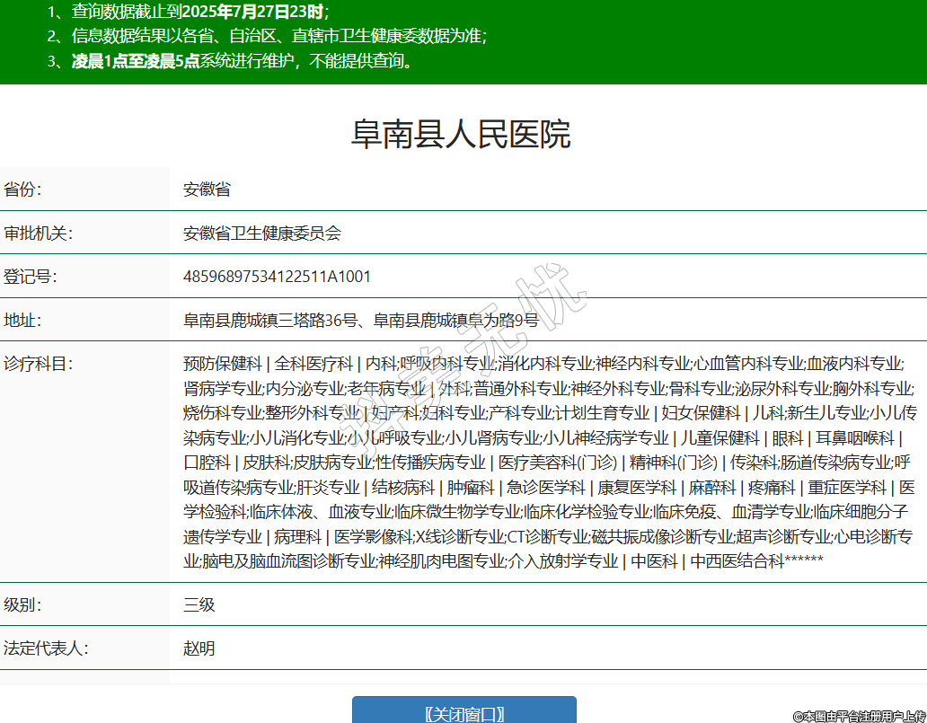 省份:安徽省審批機(jī)關(guān):安徽省衛(wèi)生健康委員會登記號:48596897534122511A1001地址:阜南縣鹿城鎮(zhèn)三塔路36號、阜南縣鹿城鎮(zhèn)阜為路9號診療科目:預(yù)防保健科 | 全科醫(yī)療科 | 內(nèi)科;呼吸內(nèi)科專業(yè);消化內(nèi)科專業(yè);神經(jīng)內(nèi)科專業(yè);心血管內(nèi)科專業(yè);血液內(nèi)科專業(yè);腎病學(xué)專業(yè);內(nèi)分泌專業(yè);老年病專業(yè) | 外科;普通外科專業(yè);神經(jīng)外科專業(yè);骨科專業(yè);泌尿外科專業(yè);胸外科專業(yè);燒傷科專業(yè);整形外科專業(yè) | 婦產(chǎn)科;婦科專業(yè);產(chǎn)科專業(yè);計劃生育專業(yè) | 婦女保健科 | 兒科;新生兒專業(yè);小兒傳染病專業(yè);小兒消化專業(yè);小兒呼吸專業(yè);小兒腎病專業(yè);小兒神經(jīng)病學(xué)專業(yè) | 兒童保健科 | 眼科 | 耳鼻咽喉科 | 口腔科 | 皮膚科;皮膚病專業(yè);性傳播疾病專業(yè) | 醫(yī)療美容科(門診) | 精神科(門診) | 傳染科;腸道傳染病專業(yè);呼吸道傳染病專業(yè);肝炎專業(yè) | 結(jié)核病科 | 腫瘤科 | 急診醫(yī)學(xué)科 | 康復(fù)醫(yī)學(xué)科 | 麻醉科 | 疼痛科 | 重癥醫(yī)學(xué)科 | 醫(yī)學(xué)檢驗科;臨床體液、血液專業(yè);臨床微生物學(xué)專業(yè);臨床化學(xué)檢驗專業(yè);臨床免疫、血清學(xué)專業(yè);臨床細(xì)胞分子遺傳學(xué)專業(yè) | 病理科 | 醫(yī)學(xué)影像科;X線診斷專業(yè);CT診斷專業(yè);磁共振成像診斷專業(yè);超聲診斷專業(yè);心電診斷專業(yè);腦電及腦血流圖診斷專業(yè);神經(jīng)肌肉電圖專業(yè);介入放射學(xué)專業(yè) | 中醫(yī)科 | 中西醫(yī)結(jié)合科******級別:三級法定代表人:趙明主要負(fù)責(zé)人:趙明執(zhí)業(yè)許可證有效期:2020/04/21 -至- 2035/04/20 -