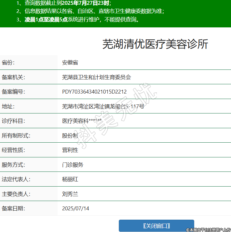 省份:安徽省備案機(jī)關(guān):蕪湖縣衛(wèi)生和計(jì)劃生育委員會(huì)備案編號(hào):PDY70336434021015D2212地址:蕪湖市灣沚區(qū)灣沚鎮(zhèn)龍璽臺(tái)S-117號(hào)診療科目:醫(yī)療美容科******所有制形式:股份制經(jīng)營(yíng)性質(zhì):營(yíng)利性服務(wù)方式:門診服務(wù)法定代表人:楊麗紅主要負(fù)責(zé)人:劉秀蘭備案日期:2025/07/14 -