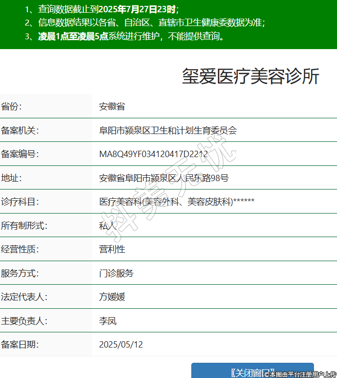 省份:安徽省備案機(jī)關(guān):阜陽市潁泉區(qū)衛(wèi)生和計劃生育委員會備案編號:MA8Q49YF034120417D2212地址:安徽省阜陽市潁泉區(qū)人民東路98號診療科目:醫(yī)療美容科(美容外科、美容皮膚科)******所有制形式:私人經(jīng)營性質(zhì):營利性服務(wù)方式:門診服務(wù)法定代表人:方媛媛主要負(fù)責(zé)人:李鳳備案日期:2025/05/12 -