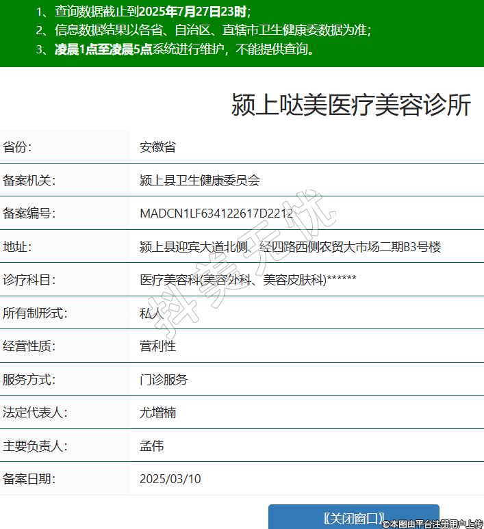 省份:安徽省備案機(jī)關(guān):潁上縣衛(wèi)生健康委員會(huì)備案編號(hào):MADCN1LF634122617D2212地址:潁上縣迎賓大道北側(cè)、經(jīng)四路西側(cè)農(nóng)貿(mào)大市場(chǎng)二期B3號(hào)樓診療科目:醫(yī)療美容科(美容外科、美容皮膚科)******所有制形式:私人經(jīng)營(yíng)性質(zhì):營(yíng)利性服務(wù)方式:門診服務(wù)法定代表人:尤增楠主要負(fù)責(zé)人:孟偉備案日期:2025/03/10 -