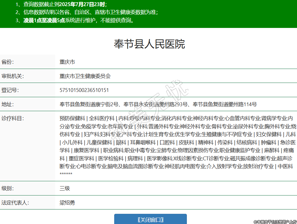 省份:重慶市審批機(jī)關(guān):重慶市衛(wèi)生健康委員會登記號:575101500236510151地址:奉節(jié)縣魚復(fù)街道康寧街2號、奉節(jié)縣永安街道夔州路293號、奉節(jié)縣魚復(fù)街道夔州路114號診療科目:預(yù)防保健科 | 全科醫(yī)療科 | 內(nèi)科;呼吸內(nèi)科專業(yè);消化內(nèi)科專業(yè);神經(jīng)內(nèi)科專業(yè);心血管內(nèi)科專業(yè);腎病學(xué)專業(yè);內(nèi)分泌專業(yè);免疫學(xué)專業(yè);老年病專業(yè) | 外科;普通外科專業(yè);神經(jīng)外科專業(yè);骨科專業(yè);泌尿外科專業(yè);胸外科專業(yè);燒傷科專業(yè) | 婦產(chǎn)科;婦科專業(yè);產(chǎn)科專業(yè);計(jì)劃生育專業(yè);優(yōu)生學(xué)專業(yè);生殖健康與不孕癥專業(yè) | 婦女保健科 | 兒科 | 小兒外科 | 兒童保健科 | 眼科 | 耳鼻咽喉科 | 口腔科 | 皮膚科 | 精神科 | 傳染科 | 結(jié)核病科 | 腫瘤科 | 急診醫(yī)學(xué)科 | 康復(fù)醫(yī)學(xué)科 | 職業(yè)病科;職業(yè)中毒專業(yè);塵肺專業(yè);物理因素?fù)p傷專業(yè);職業(yè)健康監(jiān)護(hù)專業(yè) | 麻醉科 | 疼痛科 | 重癥醫(yī)學(xué)科 | 醫(yī)學(xué)檢驗(yàn)科 | 病理科 | 醫(yī)學(xué)影像科;X線診斷專業(yè);CT診斷專業(yè);磁共振成像診斷專業(yè);超聲診斷專業(yè);心電診斷專業(yè);腦電及腦血流圖診斷專業(yè);神經(jīng)肌肉電圖專業(yè);介入放射學(xué)專業(yè);放射治療專業(yè) | 中醫(yī)科******級別:三級法定代表人:梁紹勇主要負(fù)責(zé)人:劉其輝執(zhí)業(yè)許可證有效期:2016/06/29 -至- 2031/06/28 -