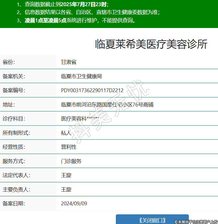 省份:甘肅省備案機關(guān):臨夏市衛(wèi)生健康局備案編號:PDY00317362290117D2212地址:臨夏市前河沿東路國星住宅小區(qū)76號商鋪診療科目:醫(yī)療美容科******所有制形式:私人經(jīng)營性質(zhì):營利性服務(wù)方式:門診服務(wù)法定代表人:王旋主要負責人:王旋備案日期:2024/09/09 -