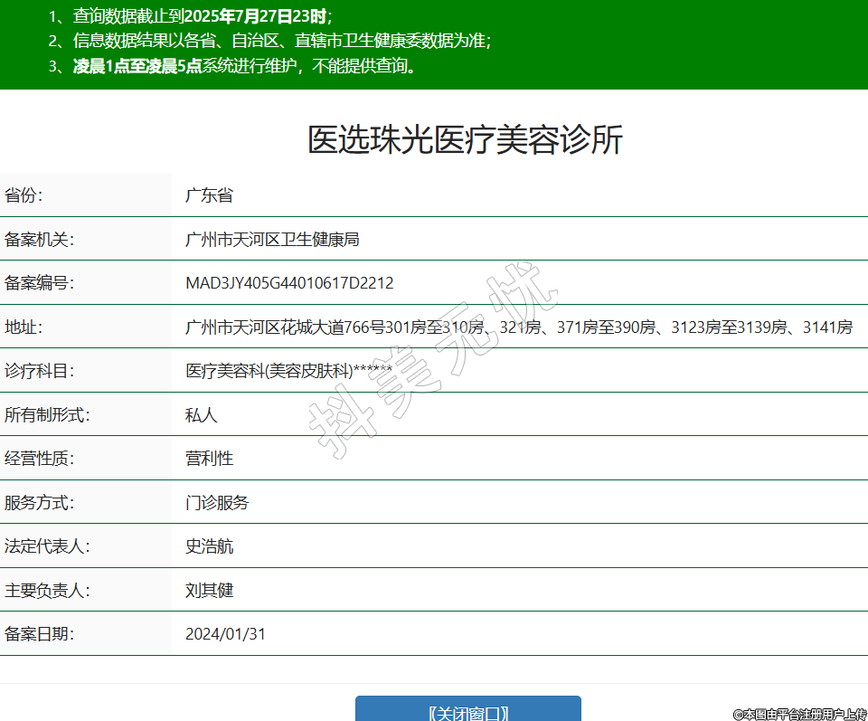 省份:廣東省備案機(jī)關(guān):廣州市天河區(qū)衛(wèi)生健康局備案編號:MAD3JY405G44010617D2212地址:廣州市天河區(qū)花城大道766號301房至310房、321房、371房至390房、3123房至3139房、3141房診療科目:醫(yī)療美容科(美容皮膚科)******所有制形式:私人經(jīng)營性質(zhì):營利性服務(wù)方式:門診服務(wù)法定代表人:史浩航主要負(fù)責(zé)人:劉其健備案日期:2024/01/31 -