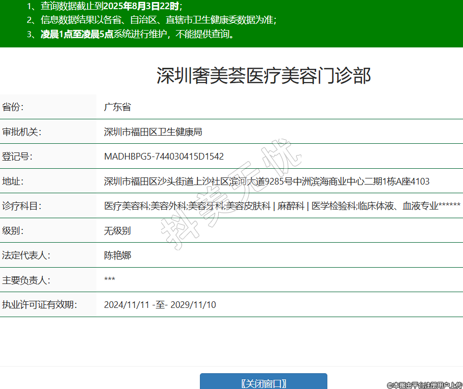 省份:廣東省審批機(jī)關(guān):深圳市福田區(qū)衛(wèi)生健康局登記號(hào):MADHBPG5-744030415D1542地址:深圳市福田區(qū)沙頭街道上沙社區(qū)濱河大道9285號(hào)中洲濱海商業(yè)中心二期1棟A座4103診療科目:醫(yī)療美容科;美容外科;美容牙科;美容皮膚科 | 麻醉科 | 醫(yī)學(xué)檢驗(yàn)科;臨床體液、血液專業(yè)******級(jí)別:無級(jí)別法定代表人:陳艷娜主要負(fù)責(zé)人:***執(zhí)業(yè)許可證有效期:2024/11/11 -至- 2029/11/10 -