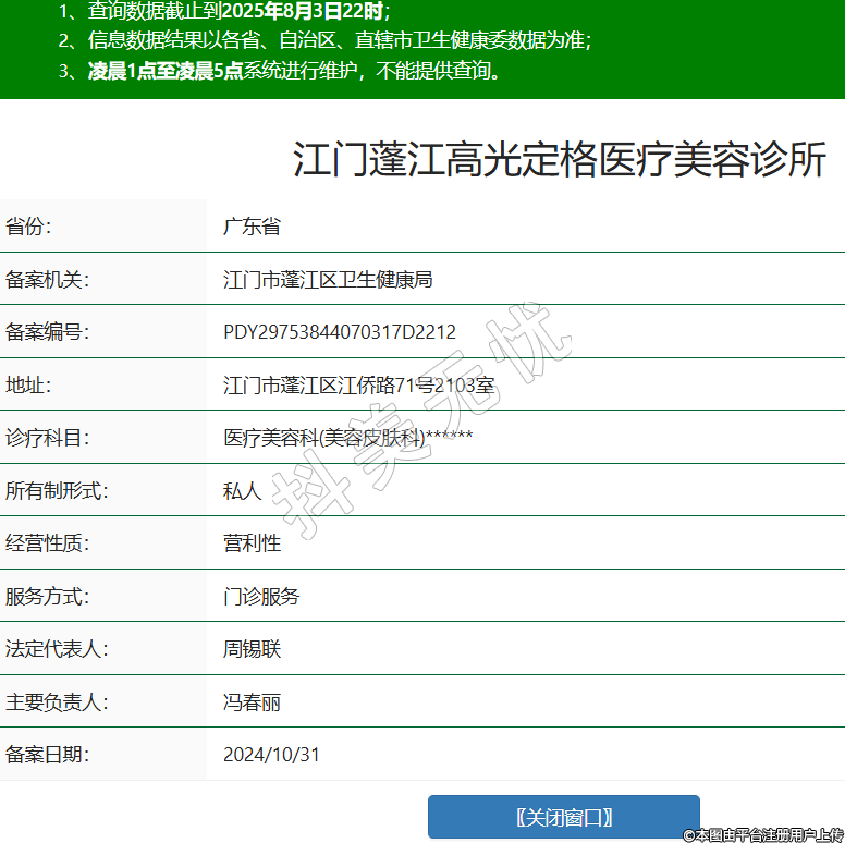 省份:廣東省備案機(jī)關(guān):江門市蓬江區(qū)衛(wèi)生健康局備案編號:PDY29753844070317D2212地址:江門市蓬江區(qū)江僑路71號2103室診療科目:醫(yī)療美容科(美容皮膚科)******所有制形式:私人經(jīng)營性質(zhì):營利性服務(wù)方式:門診服務(wù)法定代表人:周錫聯(lián)主要負(fù)責(zé)人:馮春麗備案日期:2024/10/31 -