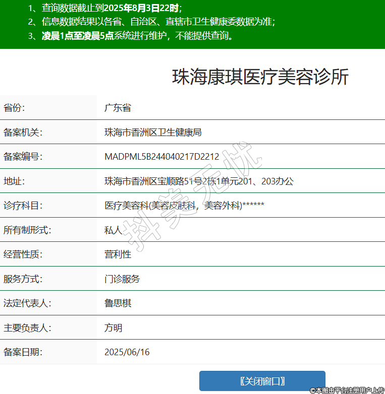 省份:廣東省備案機關(guān):珠海市香洲區(qū)衛(wèi)生健康局備案編號:MADPML5B244040217D2212地址:珠海市香洲區(qū)寶順路51號2棟1單元201、203辦公診療科目:醫(yī)療美容科(美容皮膚科,美容外科)******所有制形式:私人經(jīng)營性質(zhì):營利性服務(wù)方式:門診服務(wù)法定代表人:魯思棋主要負(fù)責(zé)人:方明備案日期:2025/06/16 -