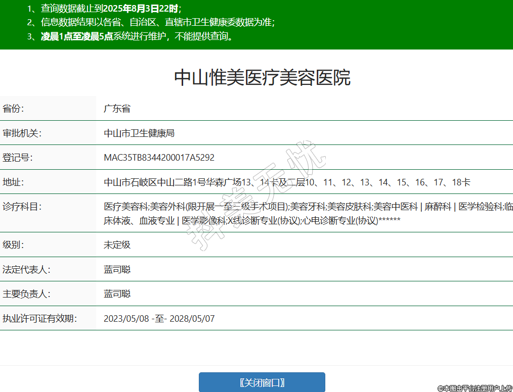 省份:廣東省審批機(jī)關(guān):中山市衛(wèi)生健康局登記號(hào):MAC35TB8344200017A5292地址:中山市石岐區(qū)中山二路1號(hào)華森廣場(chǎng)13、14卡及二層10、11、12、13、14、15、16、17、18卡診療科目:醫(yī)療美容科;美容外科(限開展一至三級(jí)手術(shù)項(xiàng)目);美容牙科;美容皮膚科;美容中醫(yī)科 | 麻醉科 | 醫(yī)學(xué)檢驗(yàn)科;臨床體液、血液專業(yè) | 醫(yī)學(xué)影像科;X線診斷專業(yè)(協(xié)議);心電診斷專業(yè)(協(xié)議)******級(jí)別:未定級(jí)法定代表人:藍(lán)司聰主要負(fù)責(zé)人:藍(lán)司聰執(zhí)業(yè)許可證有效期:2023/05/08 -至- 2028/05/07 -