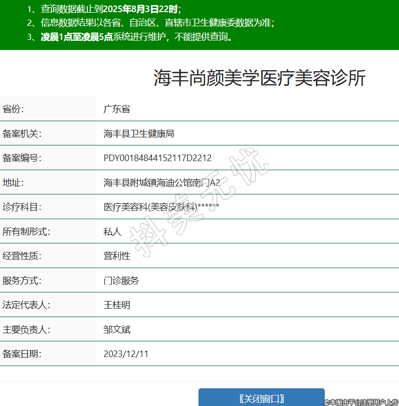 省份:廣東省備案機關(guān):海豐縣衛(wèi)生健康局備案編號:PDY00184844152117D2212地址:海豐縣附城鎮(zhèn)海迪公館南門A2診療科目:醫(yī)療美容科(美容皮膚科)******所有制形式:私人經(jīng)營性質(zhì):營利性服務(wù)方式:門診服務(wù)法定代表人:王桂明主要負(fù)責(zé)人:鄒文斌備案日期:2023/12/11 -