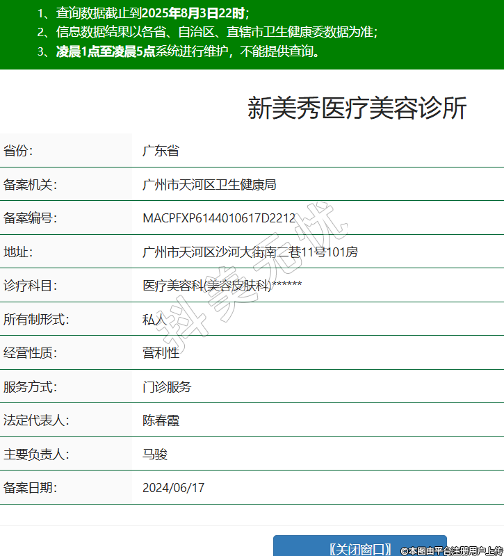 省份:廣東省備案機(jī)關(guān):廣州市天河區(qū)衛(wèi)生健康局備案編號(hào):MACPFXP6144010617D2212地址:廣州市天河區(qū)沙河大街南二巷11號(hào)101房診療科目:醫(yī)療美容科(美容皮膚科)******所有制形式:私人經(jīng)營(yíng)性質(zhì):營(yíng)利性服務(wù)方式:門診服務(wù)法定代表人:陳春霞主要負(fù)責(zé)人:馬駿備案日期:2024/06/17 -