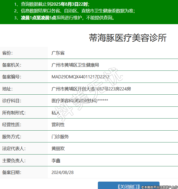 省份:廣東省備案機(jī)關(guān):廣州市黃埔區(qū)衛(wèi)生健康局備案編號(hào):MAD29DMQX44011217D2212地址:廣州市黃埔區(qū)開(kāi)創(chuàng)大道1887號(hào)223房224房診療科目:醫(yī)療美容科(美容皮膚科)******所有制形式:私人經(jīng)營(yíng)性質(zhì):營(yíng)利性服務(wù)方式:門診服務(wù)法定代表人:黃麗歡主要負(fù)責(zé)人:李鑫備案日期:2024/08/28 -