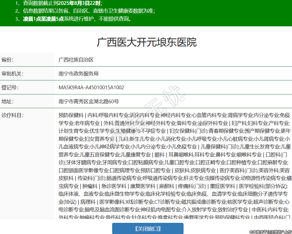 省份:廣西壯族自治區(qū)審批機(jī)關(guān):南寧市政務(wù)服務(wù)局登記號:MA5K9R4A-A45010015A1002地址:南寧市青秀區(qū)金湖北路60號診療科目:預(yù)防保健科 | 內(nèi)科;呼吸內(nèi)科專業(yè);消化內(nèi)科專業(yè);神經(jīng)內(nèi)科專業(yè);心血管內(nèi)科專業(yè);腎病學(xué)專業(yè);內(nèi)分泌專業(yè);免疫學(xué)專業(yè);老年病專業(yè) | 外科;普通外科專業(yè);神經(jīng)外科專業(yè);骨科專業(yè);泌尿外科專業(yè) | 婦產(chǎn)科;婦科專業(yè);產(chǎn)科專業(yè);計劃生育專業(yè);優(yōu)生學(xué)專業(yè);生殖健康與不孕癥專業(yè) | 婦女保健科(門診);青春期保健專業(yè);圍產(chǎn)期保健專業(yè);更年期保健專業(yè);婦女營養(yǎng)專業(yè) | 兒科;新生兒專業(yè);小兒消化專業(yè);小兒呼吸專業(yè);小兒心臟病專業(yè);小兒腎病專業(yè);小兒血液病專業(yè);小兒神經(jīng)病學(xué)專業(yè);小兒內(nèi)分泌專業(yè);小兒免疫專業(yè) | 兒童保健科(門診);兒童生長發(fā)育專業(yè);兒童營養(yǎng)專業(yè);兒童五官保健專業(yè);兒童康復(fù)專業(yè) | 眼科 | 耳鼻咽喉科;耳科專業(yè);鼻科專業(yè);咽喉科專業(yè) | 口腔科(門診);牙體牙髓病專業(yè);牙周病專業(yè);口腔粘膜病專業(yè);兒童口腔專業(yè);口腔正畸專業(yè);口腔種植專業(yè);口腔麻醉專業(yè);口腔頜面醫(yī)學(xué)影像專業(yè);口腔病理專業(yè);預(yù)防口腔專業(yè) | 皮膚科;皮膚病專業(yè) | 醫(yī)療美容科(門診);美容外科;美容皮膚科 | 傳染科(門診);腸道傳染病專業(yè);呼吸道傳染病專業(yè);肝炎專業(yè);蟲媒傳染病專業(yè);動物源性傳染病專業(yè);蠕蟲病專業(yè) | 腫瘤科 | 急診醫(yī)學(xué)科 | 康復(fù)醫(yī)學(xué)科 | 麻醉科 | 疼痛科(門診) | 重癥醫(yī)學(xué)科 | 醫(yī)學(xué)檢驗(yàn)科(部分協(xié)議);臨床體液、血液專業(yè);臨床微生物學(xué)專業(yè);臨床化學(xué)檢驗(yàn)專業(yè);臨床免疫、血清學(xué)專業(yè);臨床細(xì)胞分子遺傳學(xué)專業(yè)(協(xié)議) | 病理科 | 醫(yī)學(xué)影像科;X線診斷專業(yè);CT診斷專業(yè);磁共振成像診斷專業(yè);核醫(yī)學(xué)專業(yè);超聲診斷專業(yè);心電診斷專業(yè);腦電及腦血流圖診斷專業(yè);神經(jīng)肌肉電圖專業(yè);介入放射學(xué)專業(yè);放射治療專業(yè) | 中醫(yī)科;內(nèi)科專業(yè);外科專業(yè);腫瘤科專業(yè);骨傷科專業(yè);針灸科專業(yè);推拿科專業(yè);康復(fù)醫(yī)學(xué)專業(yè);預(yù)防保健科專業(yè) | 中西醫(yī)結(jié)合科(門診)******級別:三級法定代表人:吳想軍主要負(fù)責(zé)人:劉震宇執(zhí)業(yè)許可證有效期:2025/05/30 -至- 2034/01/20 -