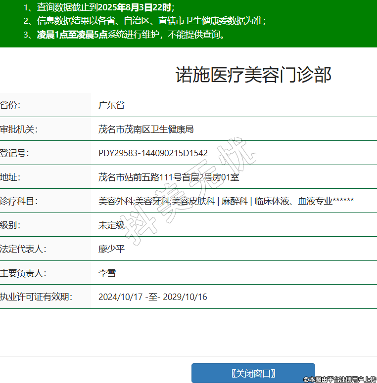 省份:廣東省審批機關:茂名市茂南區(qū)衛(wèi)生健康局登記號:PDY29583-144090215D1542地址:茂名市站前五路111號首層2號房01室診療科目:美容外科;美容牙科;美容皮膚科 | 麻醉科 | 臨床體液、血液專業(yè)******級別:未定級法定代表人:廖少平主要負責人:李雪執(zhí)業(yè)許可證有效期:2024/10/17 -至- 2029/10/16 -