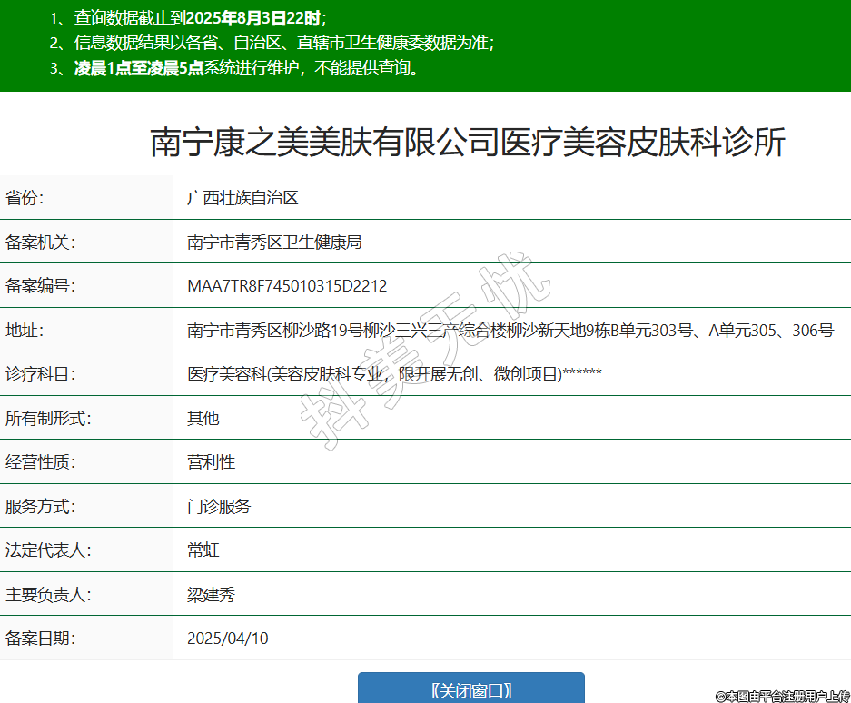 省份:廣西壯族自治區(qū)備案機(jī)關(guān):南寧市青秀區(qū)衛(wèi)生健康局備案編號:MAA7TR8F745010315D2212地址:南寧市青秀區(qū)柳沙路19號柳沙三興三產(chǎn)綜合樓柳沙新天地9棟B單元303號、A單元305、306號診療科目:醫(yī)療美容科(美容皮膚科專業(yè),限開展無創(chuàng)、微創(chuàng)項(xiàng)目)******所有制形式:其他經(jīng)營性質(zhì):營利性服務(wù)方式:門診服務(wù)法定代表人:常虹主要負(fù)責(zé)人:梁建秀備案日期:2025/04/10 -